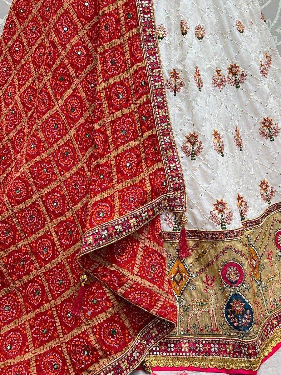 The set includes a matching color gadhawal silk choli, also embellished with fancy embroidered work, sequin work, zari work, and zircon work. To complete the look, it comes with a stunning red chiffon dupatta adorned with bandhani print work, paper mirror work, and a fancy lace border.