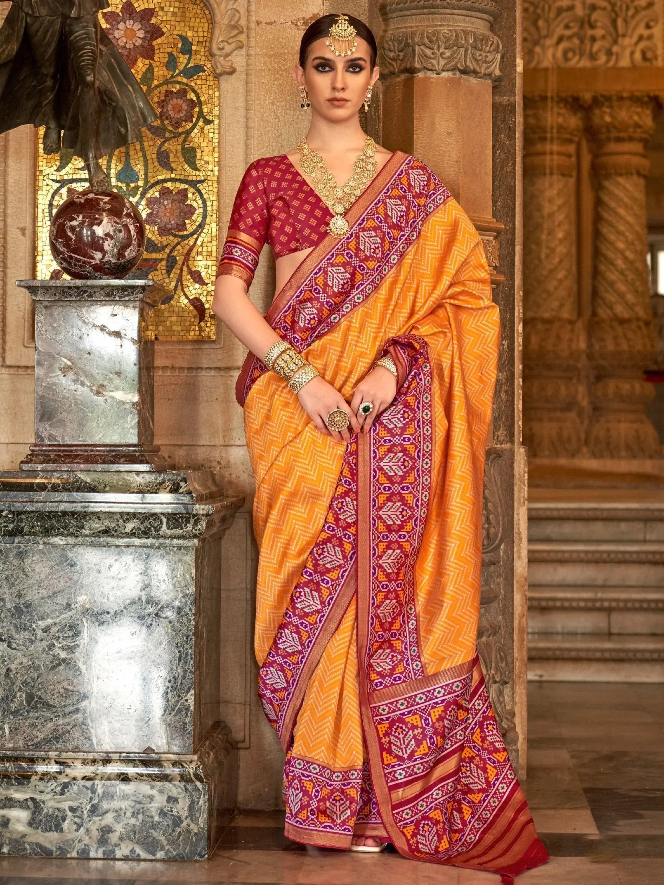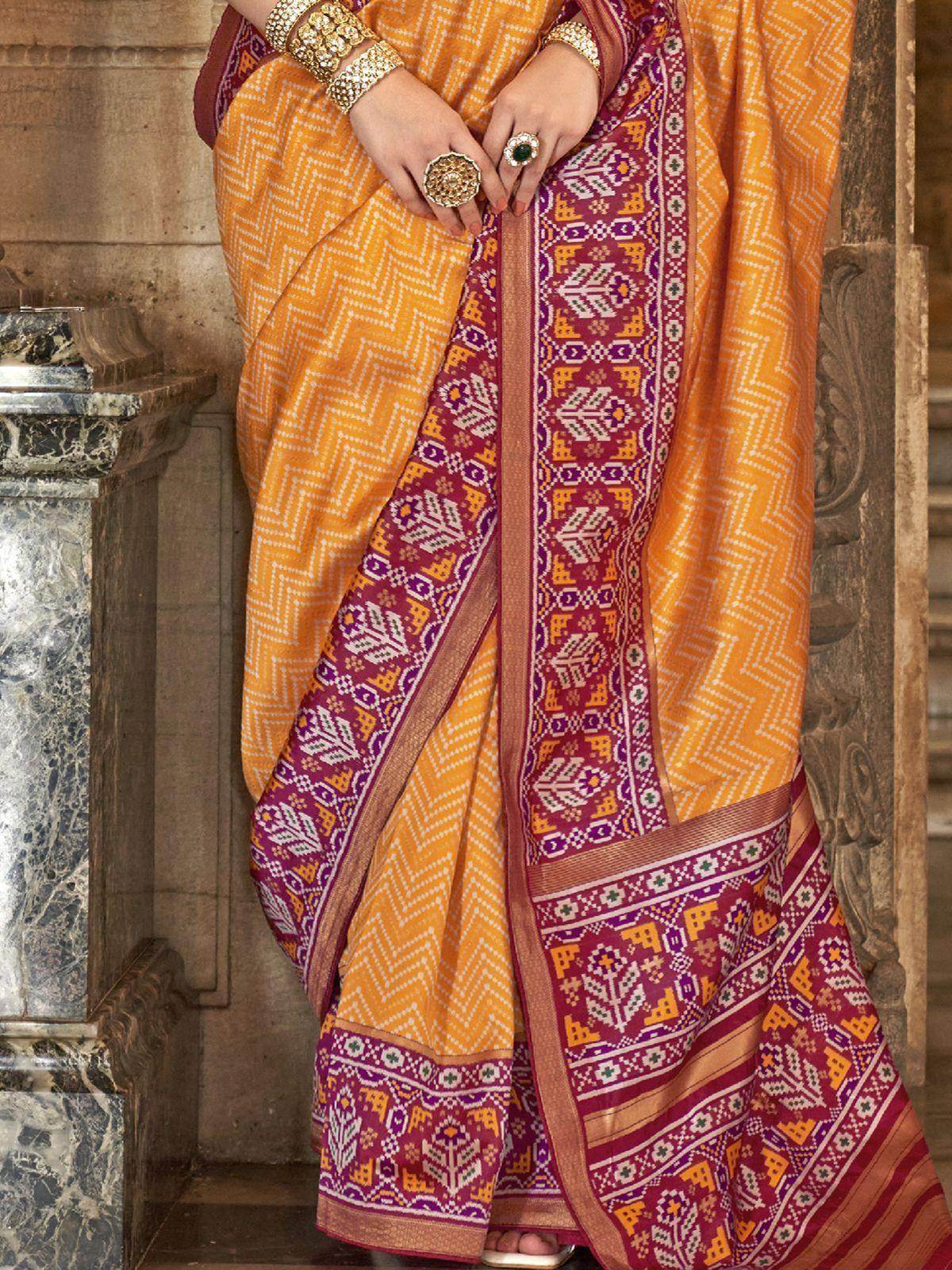 Add a touch of elegance and grace to your wardrobe with our enchanting yellow patola printed silk traditional saree with blouse. This stunning saree features a vibrant yellow color with intricate zari patola print work, perfect for adding a pop of color to your festive and wedding looks. The saree comes with a maroon silk blouse with matching patola print work, adding a complementary touch to the overall ensemble.