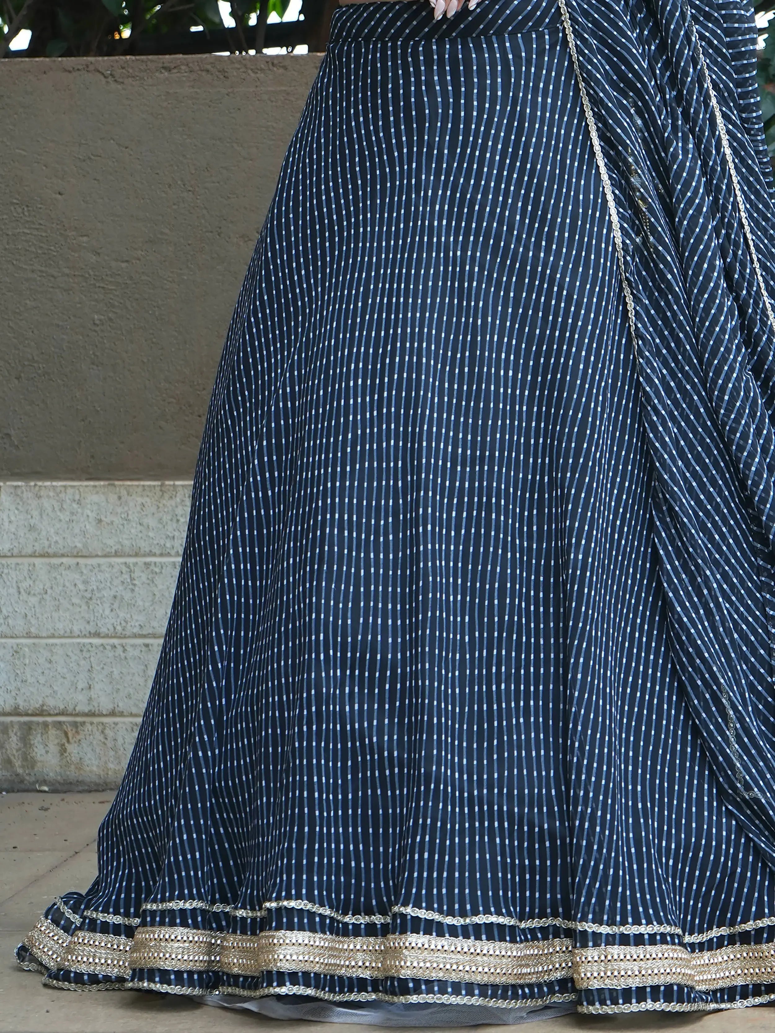 Everyone will admire you when you wear this clad to elegant affairs. Real beauty comes out from your dressing style with this black georgette line lehenga choli. This ravishing attire amazingly highlights its beauty in leheriya print.
