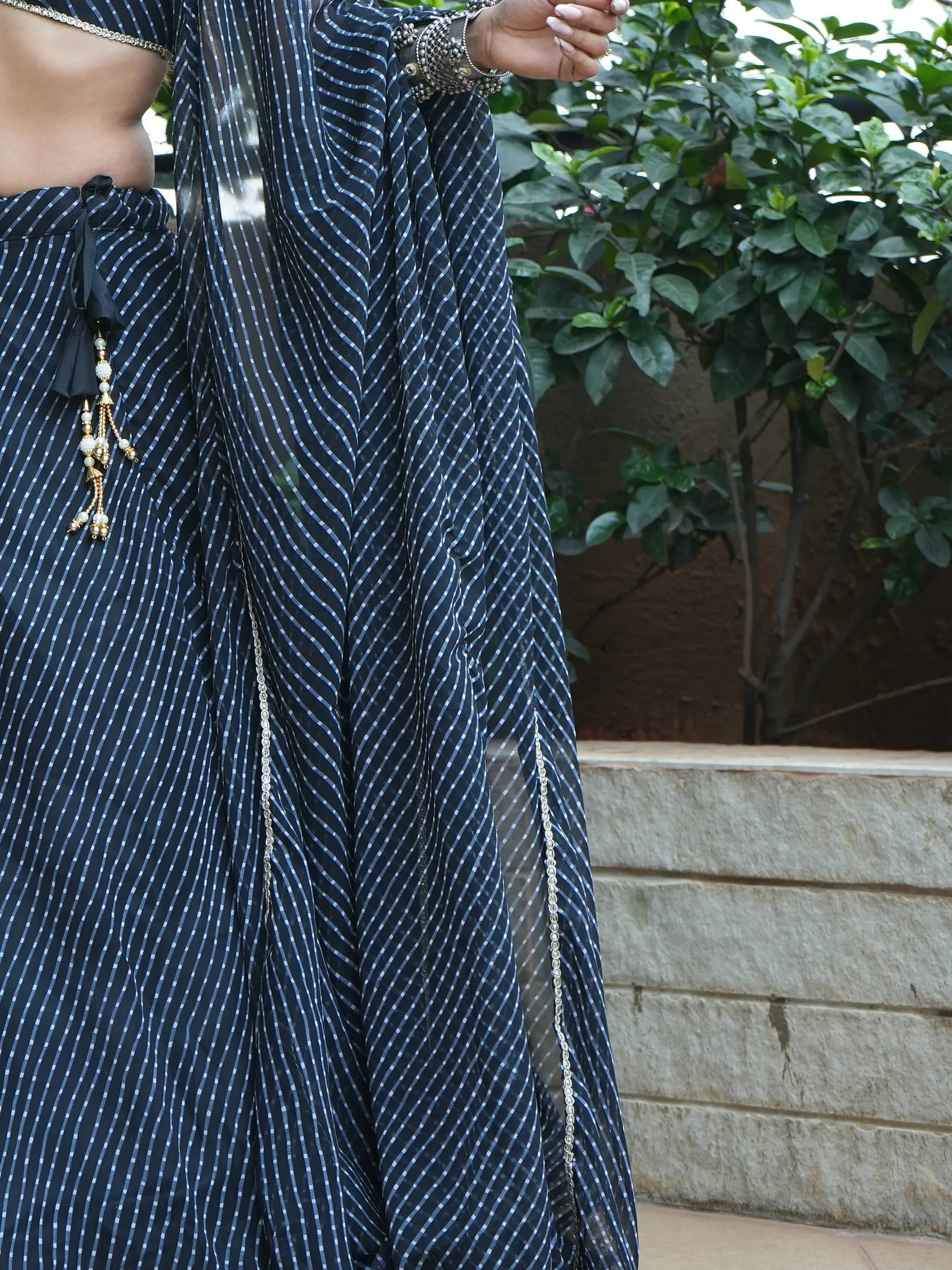 This Featured gorgeous black lehenga comes with matching choli in georgette with a similar leheriya print and also has the same dupatta in a similar color.