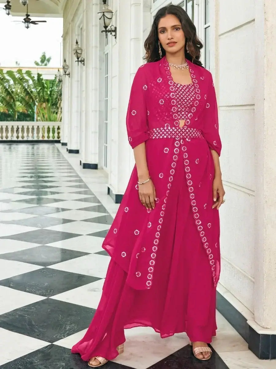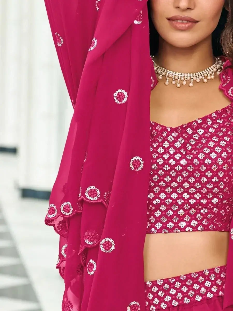 Adorn your vogue with fancy indo-western style georgette fabric fuscia pink lehenga A-line flare and detachable waistbelt elevates with fully embroidry and sequines.