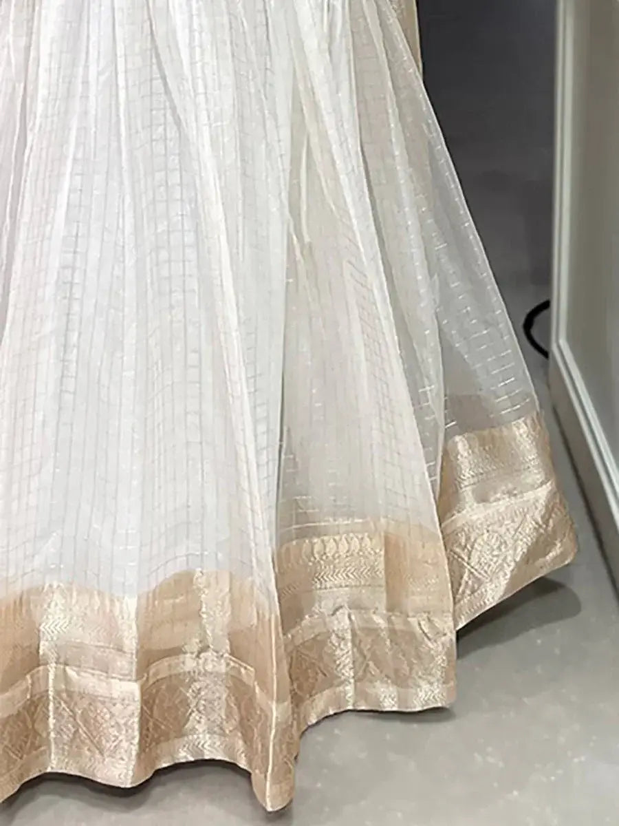 Create your occasional look more impressive by enrobing yourself in this stunning white zari-weaving organza lehenga. Crafted with exquisite attention to detail, this lehenga is made with high-quality organza material and features intricate zari weaving work. The white color adds a touch of elegance, making it perfect for weddings, festivals, functions, events, and other special occasions.