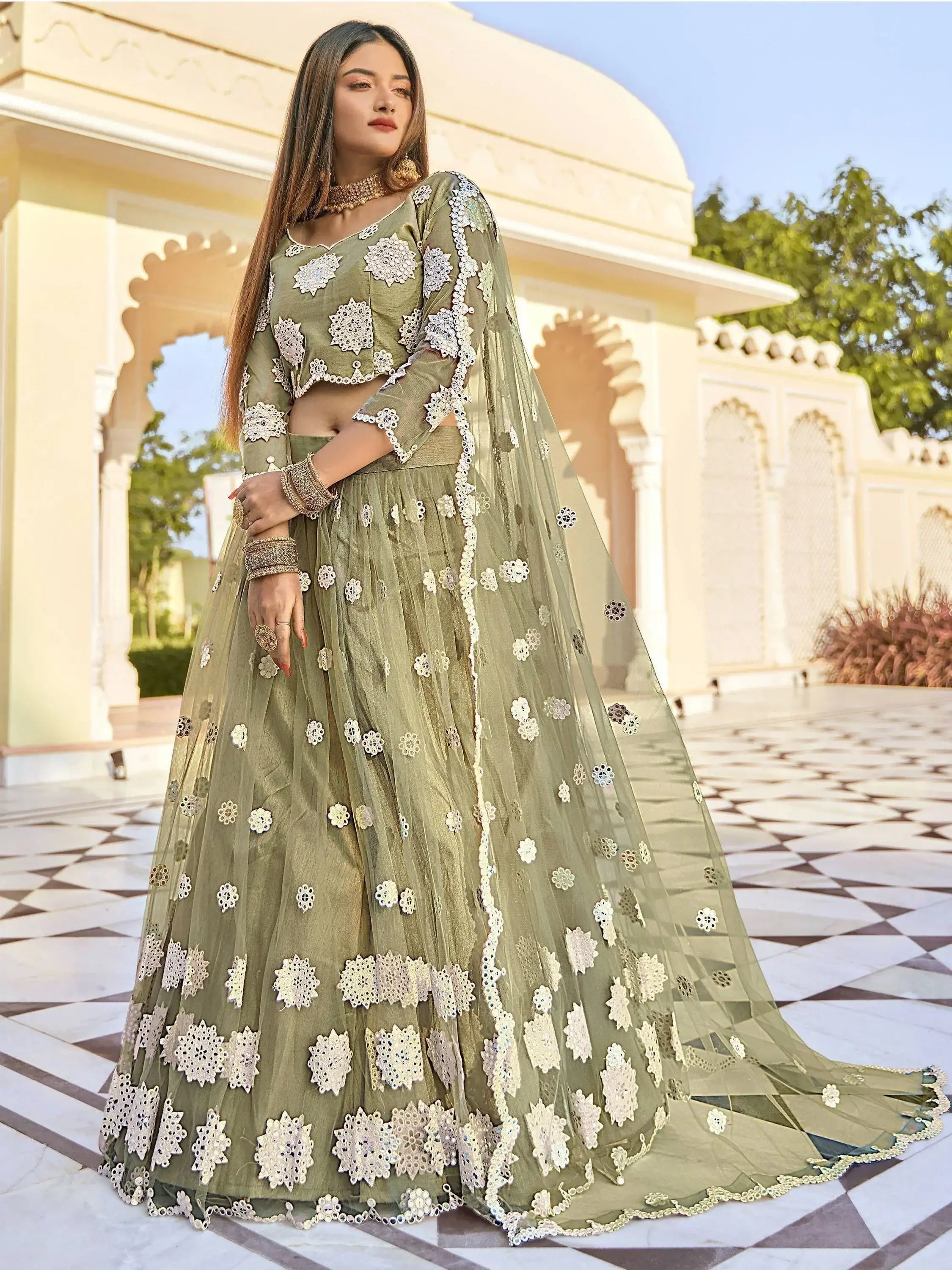 Pista Green Dori Thread Embroidered Net Wedding Lehenga Choli