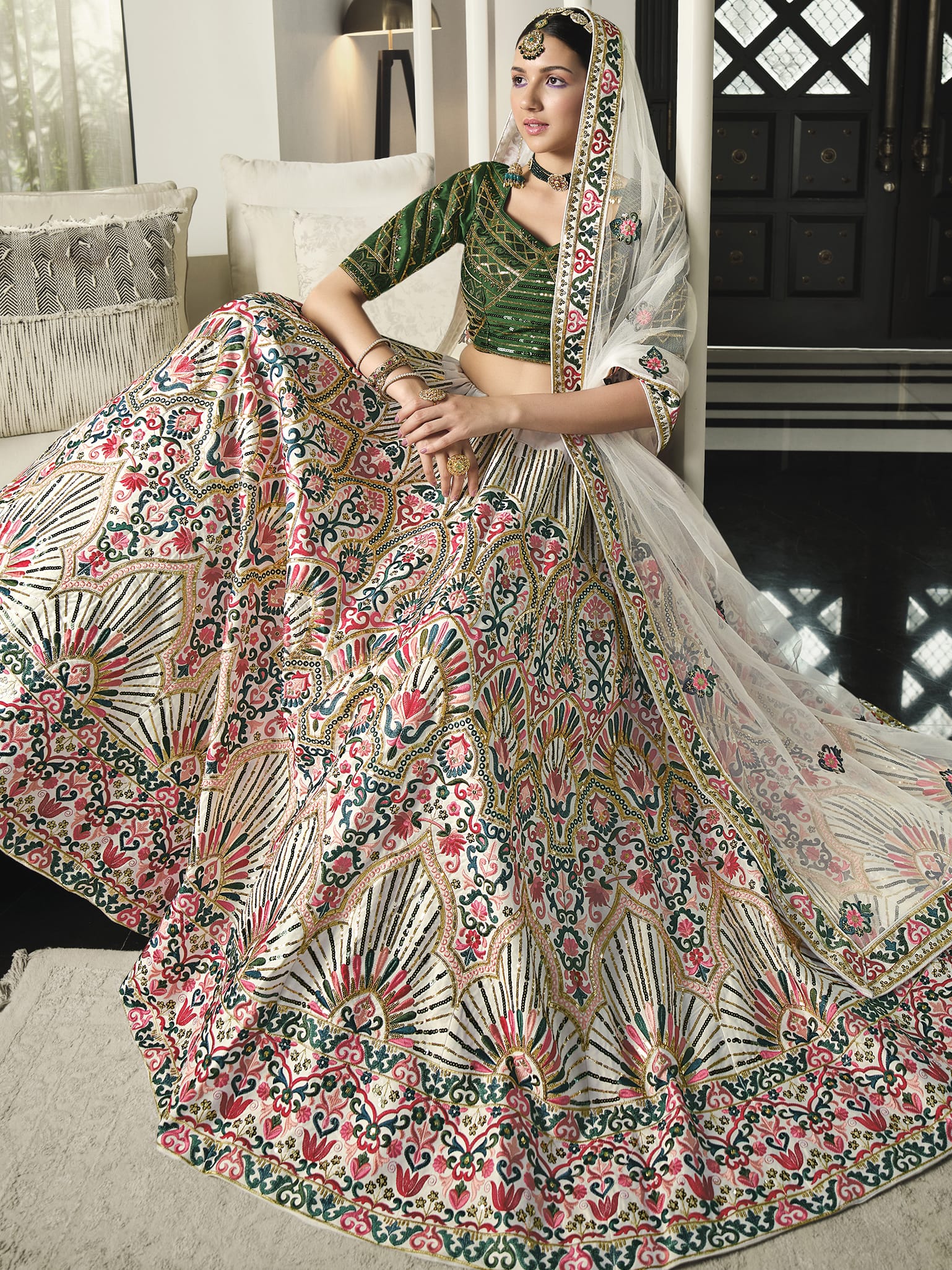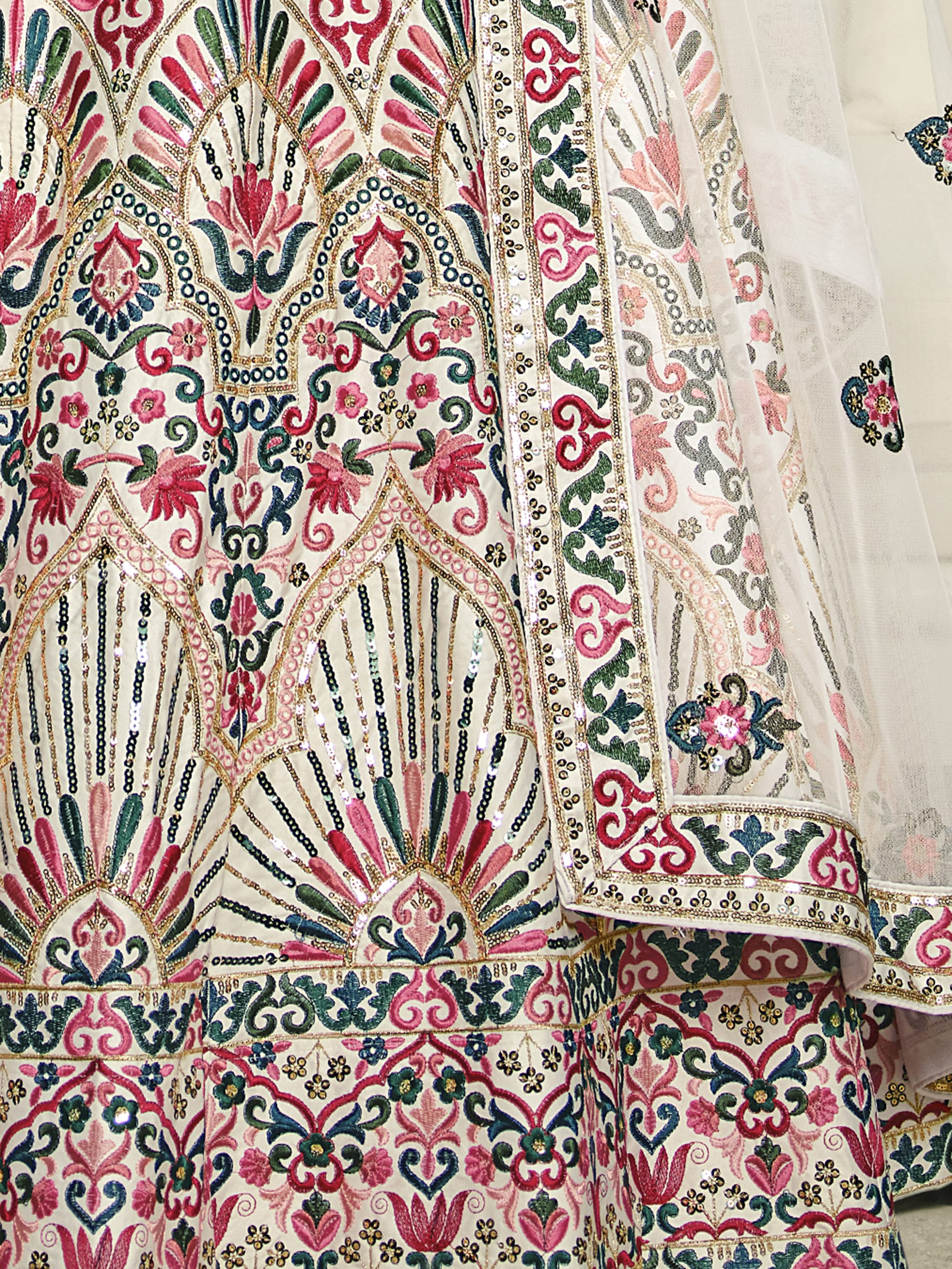 Organize yourself in a glamour of a season with this white-colored party wear lehenga choli. The lehenga is beautified with heavy sequins and multi-color thread embroidery work all over the lehenga.