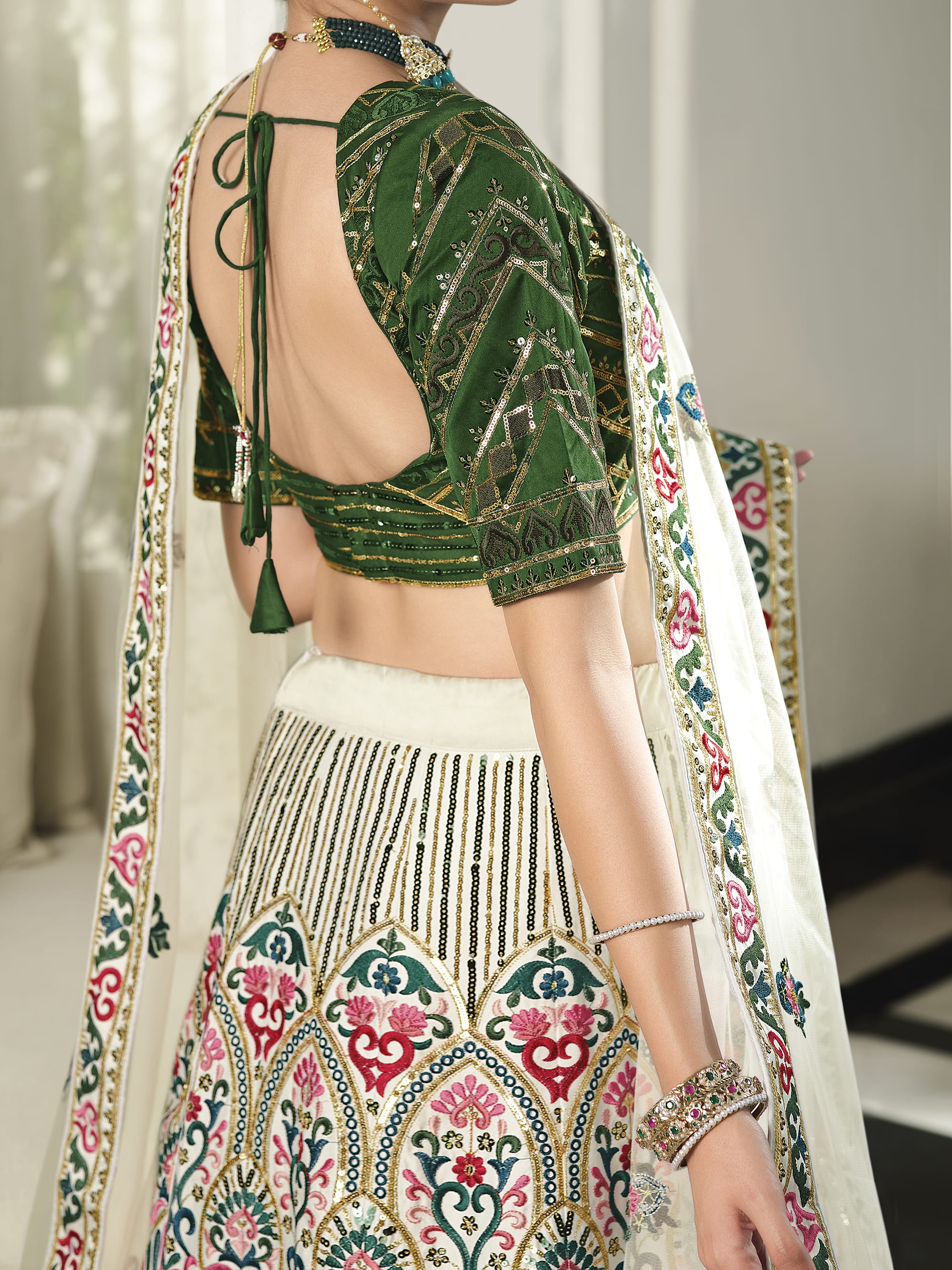 The lehenga is paired with captivating green-colored choli formed with heavy sequins and thread embroidery work and also has a similar colored net material dupatta designed with embroidered laced borders.