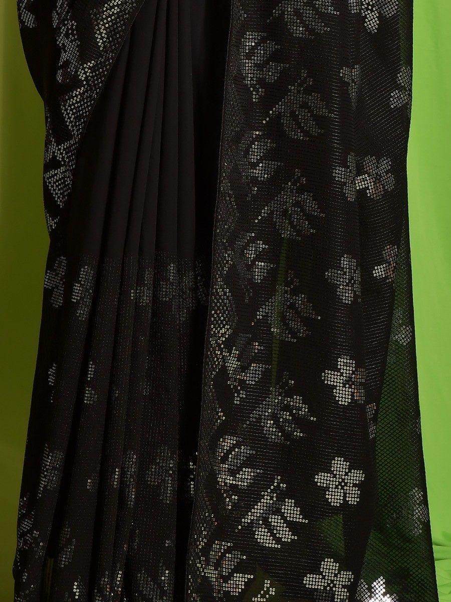 The saree comes in a length of 5.50 meters and is accompanied by an unstitched blouse material. The blouse is designed in a similar black color with art silk material and also features sequin work, adding a touch of elegance. Additionally, the saree comes with a matching sequin work belt, enhancing its overall charm.