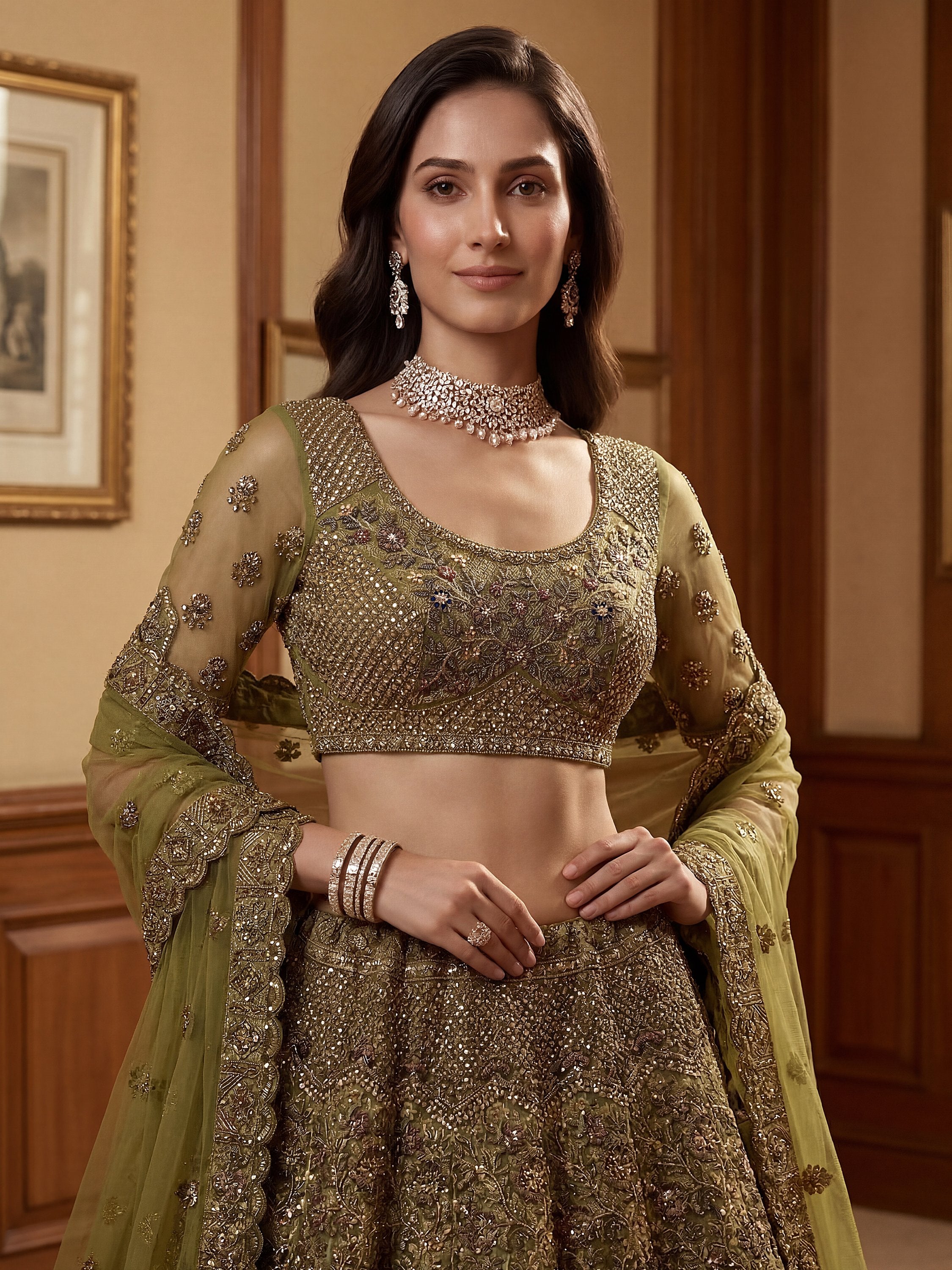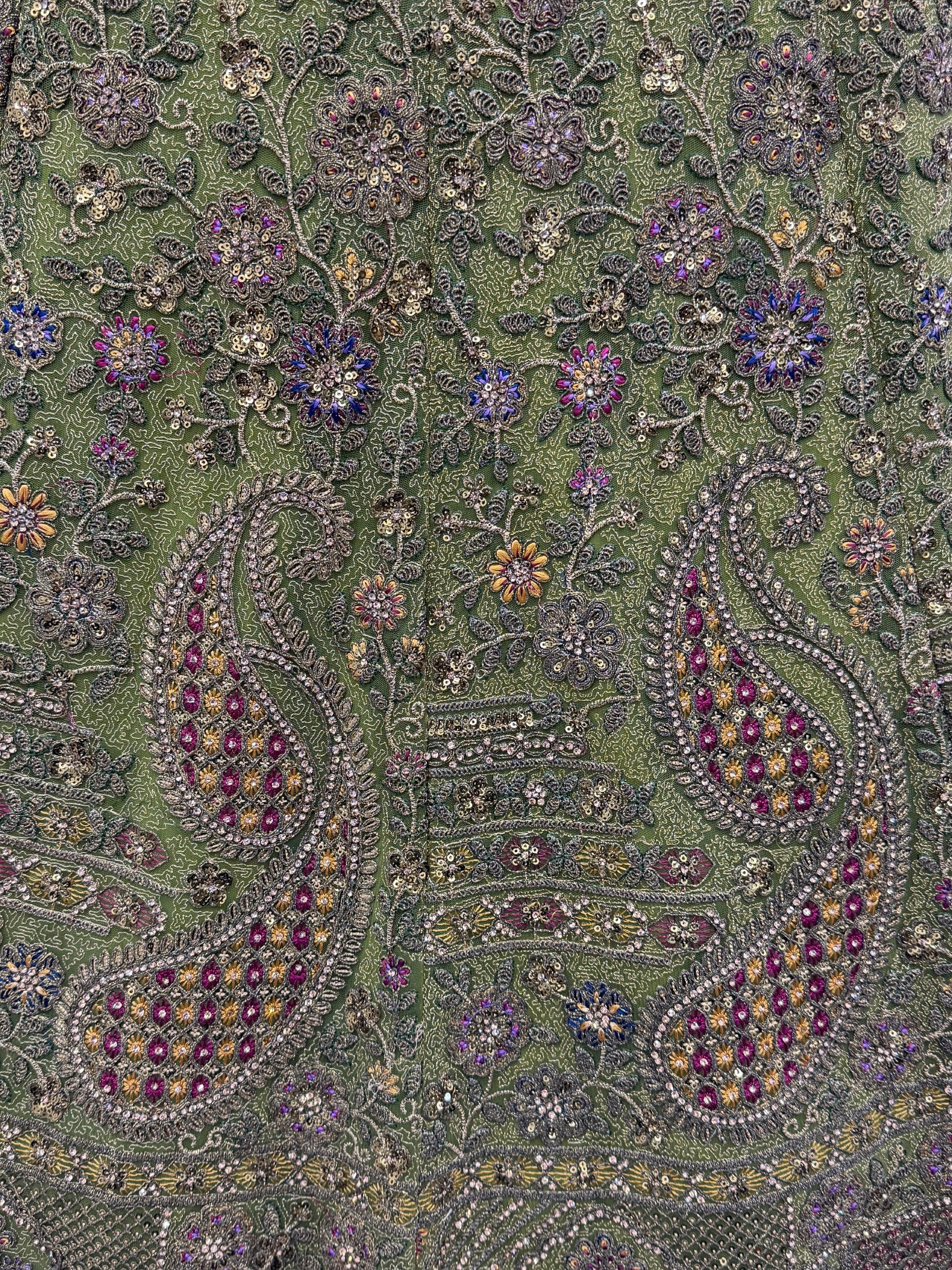This elegant olive green bridal lehenga with antique gold detailing features rich embroidery in tones of maroon, bronze, and muted gold with a soft shimmer. It comes with standard stitching, cancan and canvas attached, and a grand 4+ meter flair.