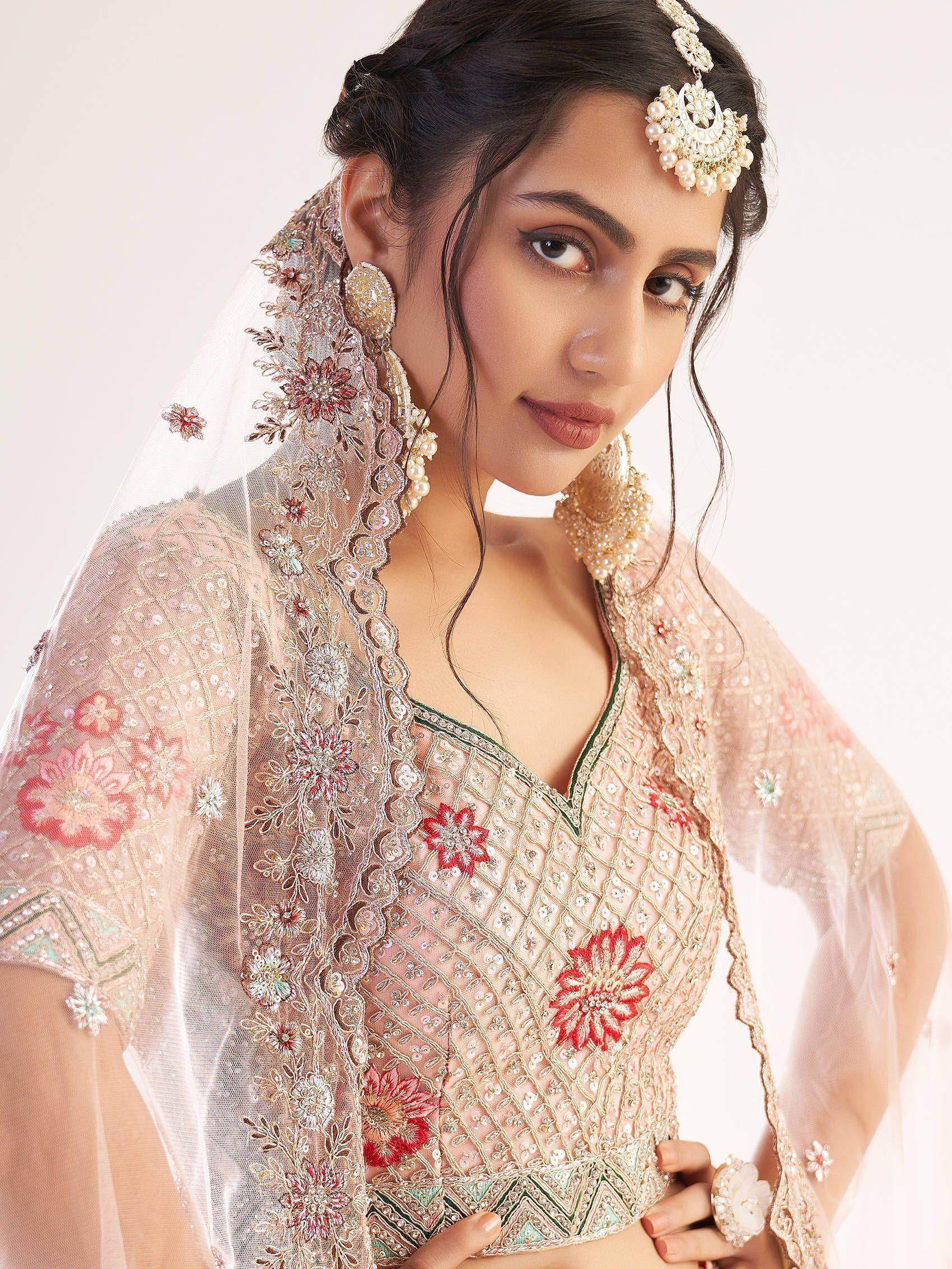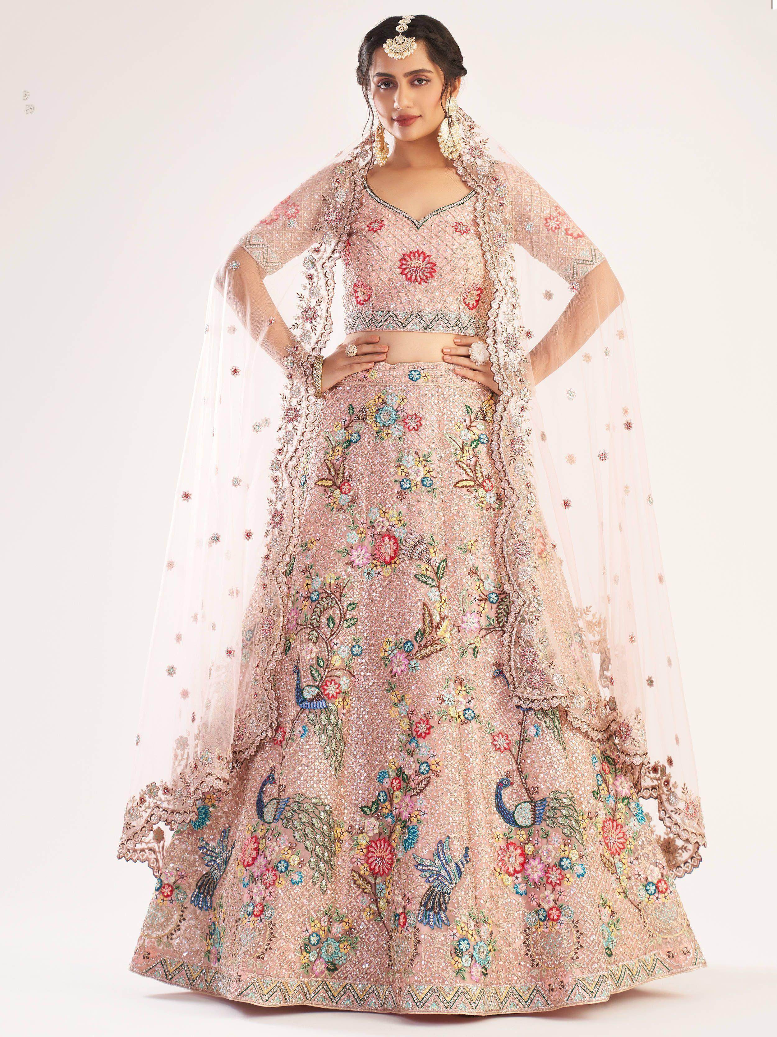 Let your elegance reflect and get compliments with this beautiful peach color lehenga made of heavy butterfly net material embellished with all-over cording, thread, sequins embroidery, and heavy zarkan handwork featured with attached can-can inside.