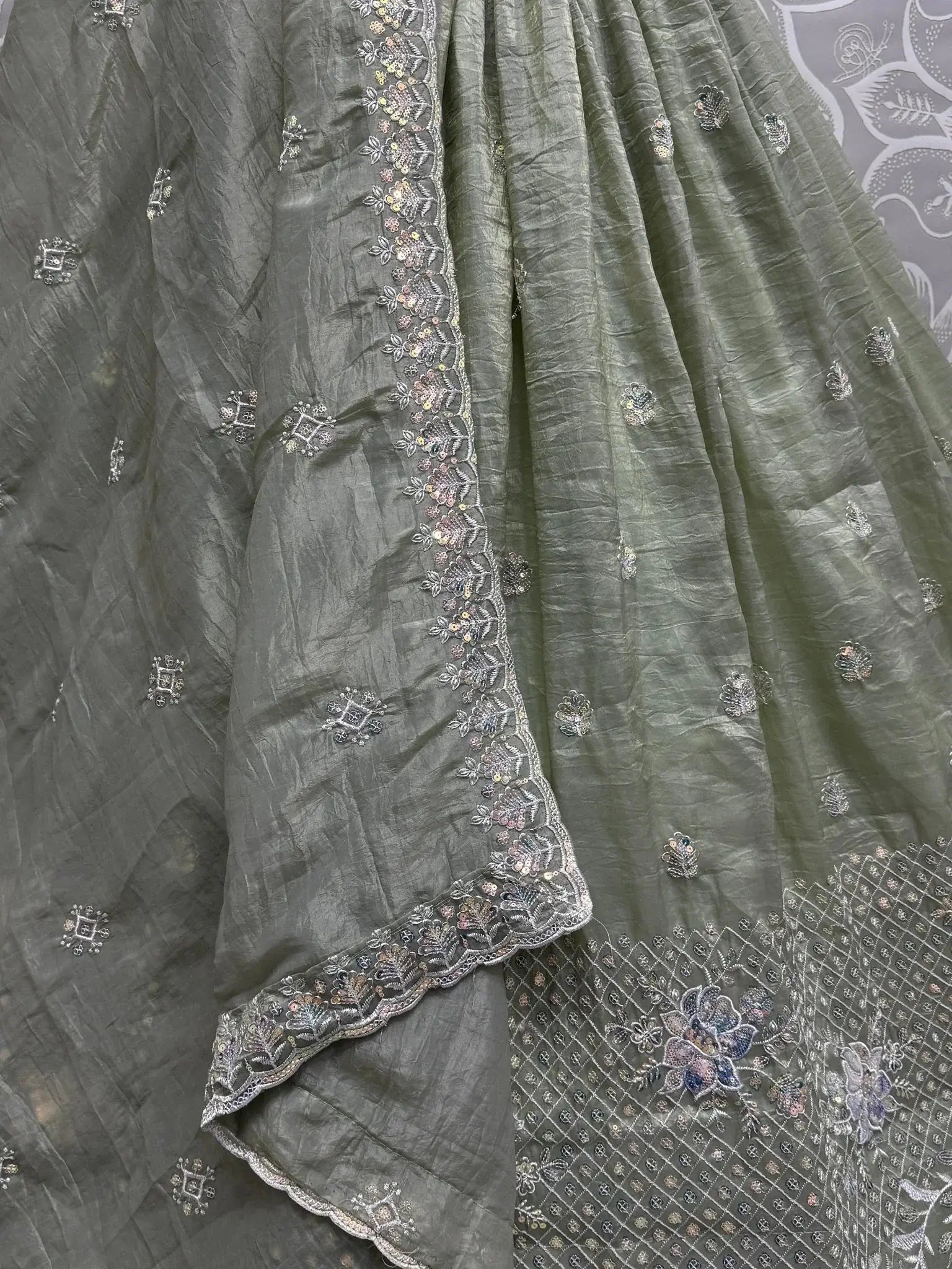 This stunning ensemble includes a pista green color organza lehenga with intricate zari embroidered work, sequin work, fancy pattern embroidery work, and multi-thread work. The lehenga is complemented by a matching organza choli and dupatta, both adorned with similar zari embroidery, sequin work, and threadwork with an attractive lace border.