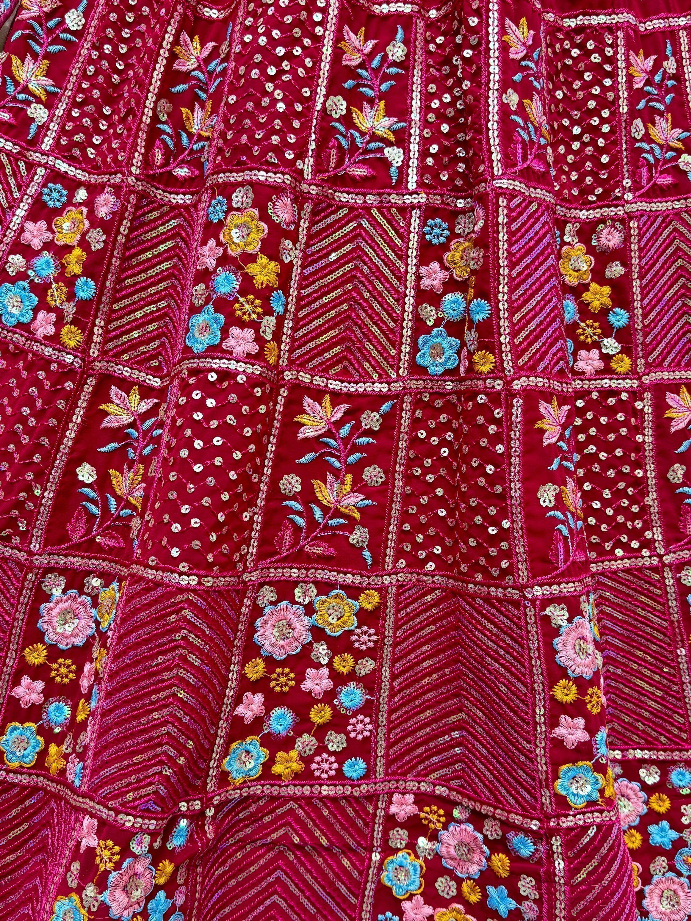 Introducing our "excellent red thread work georgette bridal lehenga choli with dupatta", a stunning attire that will make you stand out at weddings, receptions, and special occasions. This gorgeous set includes a red color georgette material lehenga with multi-thread sequin work, a matching choli with similar thread work, and an off-white dupatta with four sides of beautiful lace work.