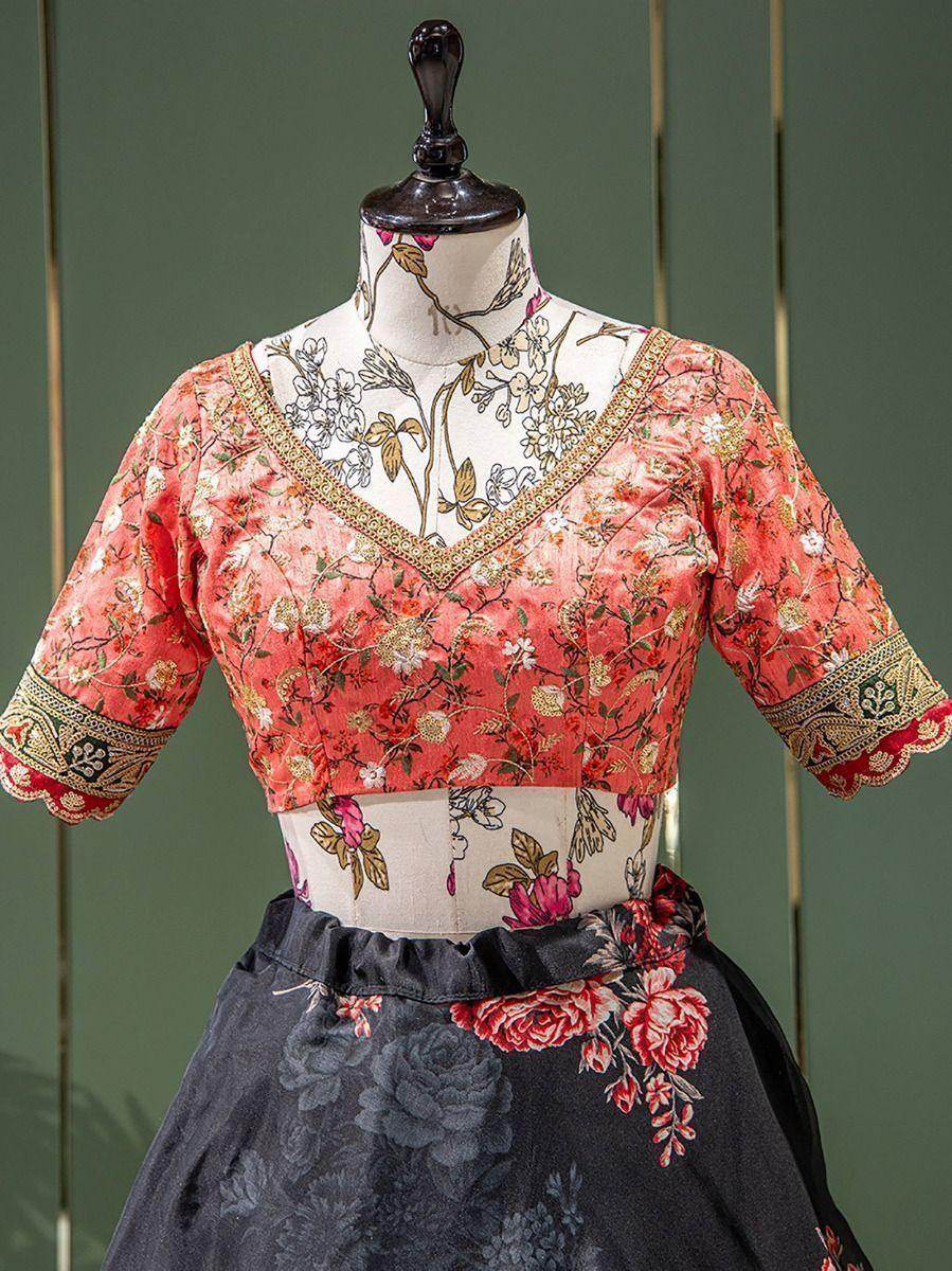 With the innovation and daily changing trends, it become tedious to choose perfect lehenga here a black organza lehenga with floral print and embroidered lace is one of the best choice.