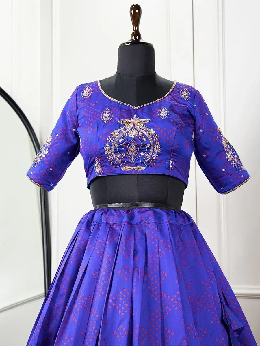 The set includes a beautiful royal blue choli and lehenga made from luxurious jacquard silk. The intricate thread weaving work and hand-stitched designs add a touch of elegance to the ensemble. The lehenga's inner lining is crafted from comfortable micro cotton, ensuring all-day comfort.
