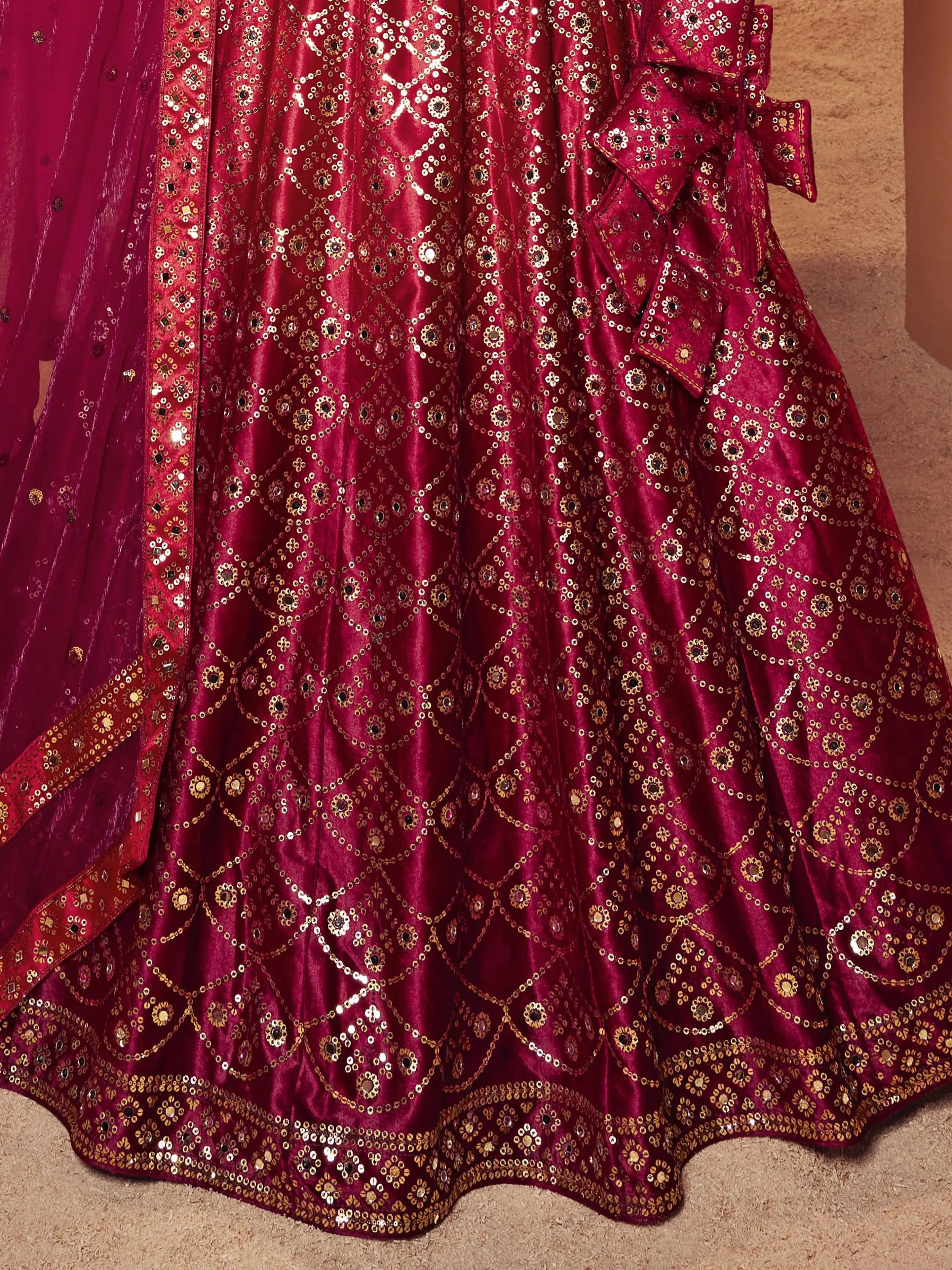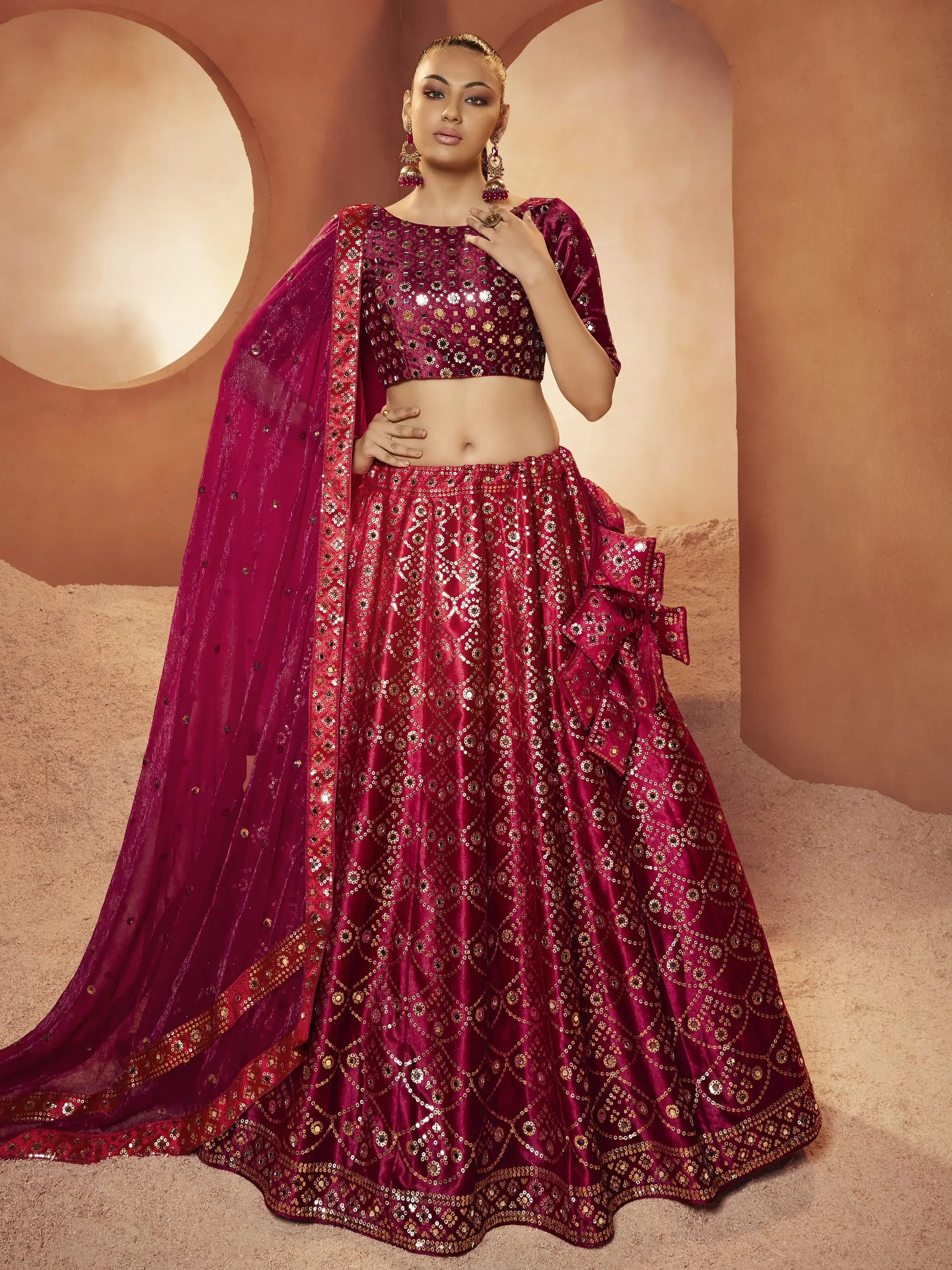 Create a magnificent effect with your fashion sense by wearing a magenta-color sequin lehenga choli. This magenta color lehenga is made of velvet material embellished with sequins embroidery with all-over mirror work.