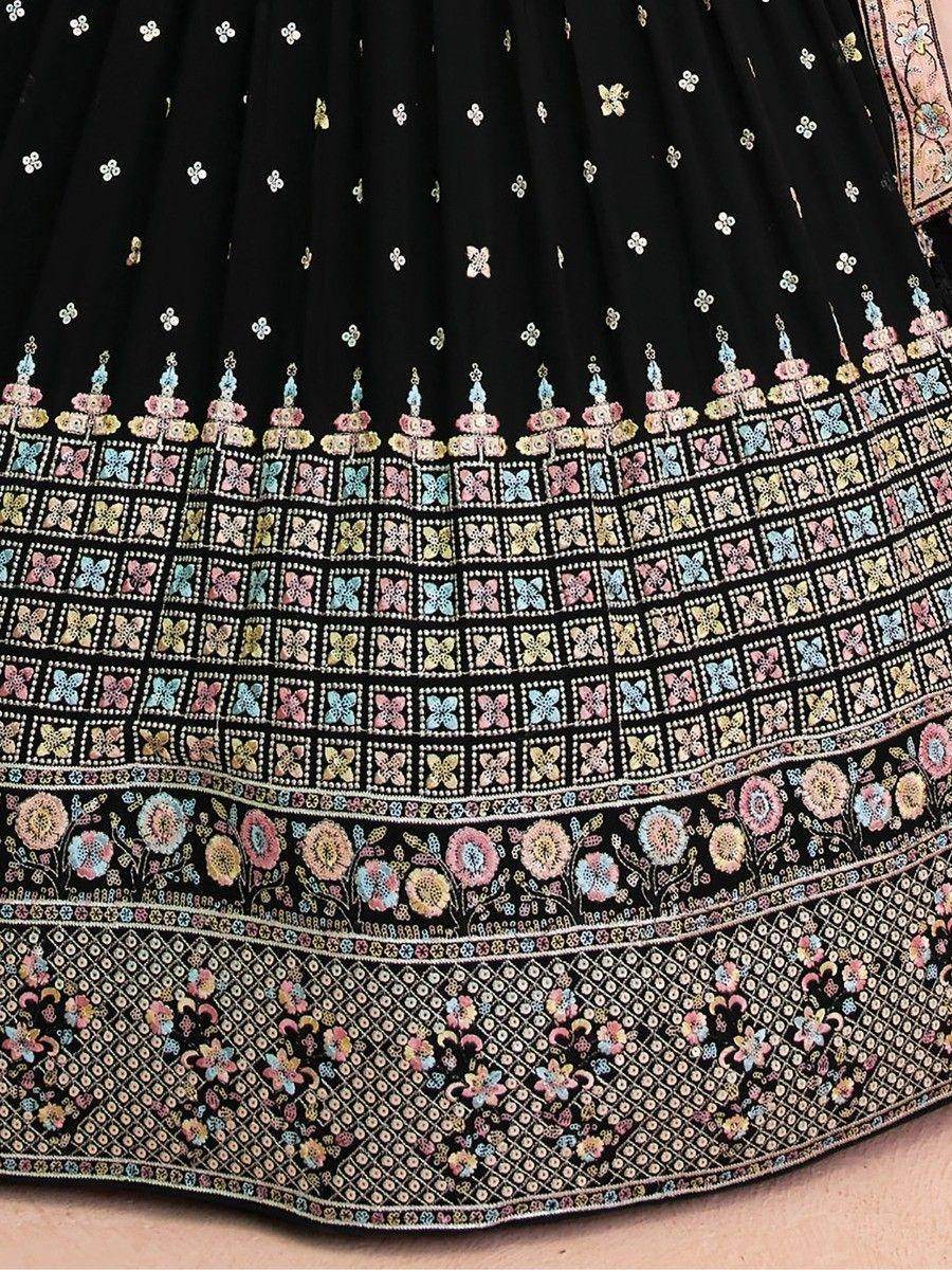 Introducing our fabulous black sequins georgette reception wear lehenga choli, a must-have for modern women looking for the latest in reception wear fashion. This exquisite ready-to-wear ensemble includes a black color georgette material lehenga adorned with stunning sequin work and intricate thread embroidery.