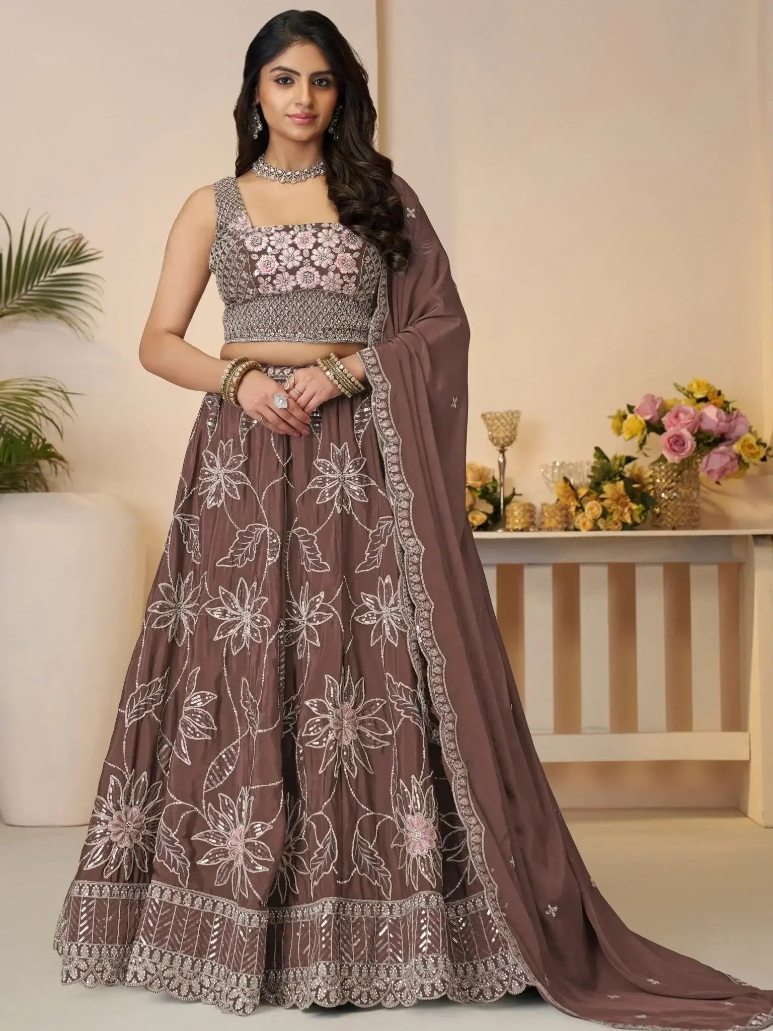The warm brown tone offers a sophisticated and earthy charm, perfect for both day and evening events. It brings a sense of understated luxury, enhanced by the shimmering details that reflect light beautifully. Whether you're attending a wedding or a grand celebration, this lehenga promises effortless style and presence.