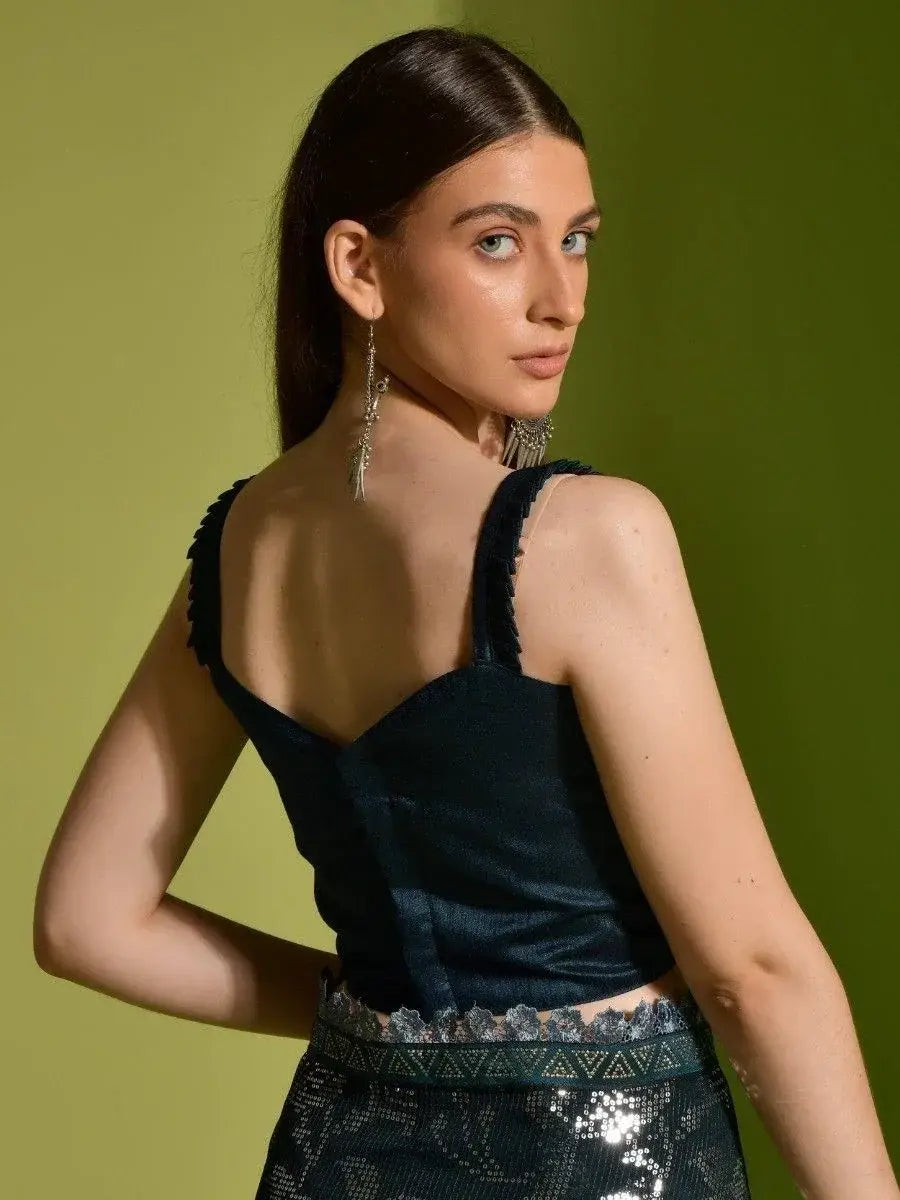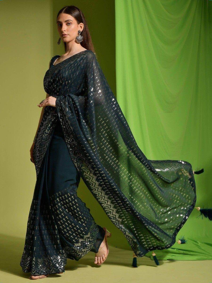 Our dark green sequins georgette designer saree stands out with its attention to detail. The intricate sequin embroidery work adds a touch of glamour, catching the light and giving you an ethereal glow. The sleek silhouette and drape of the saree enhance your natural curves, making you feel confident and beautiful.