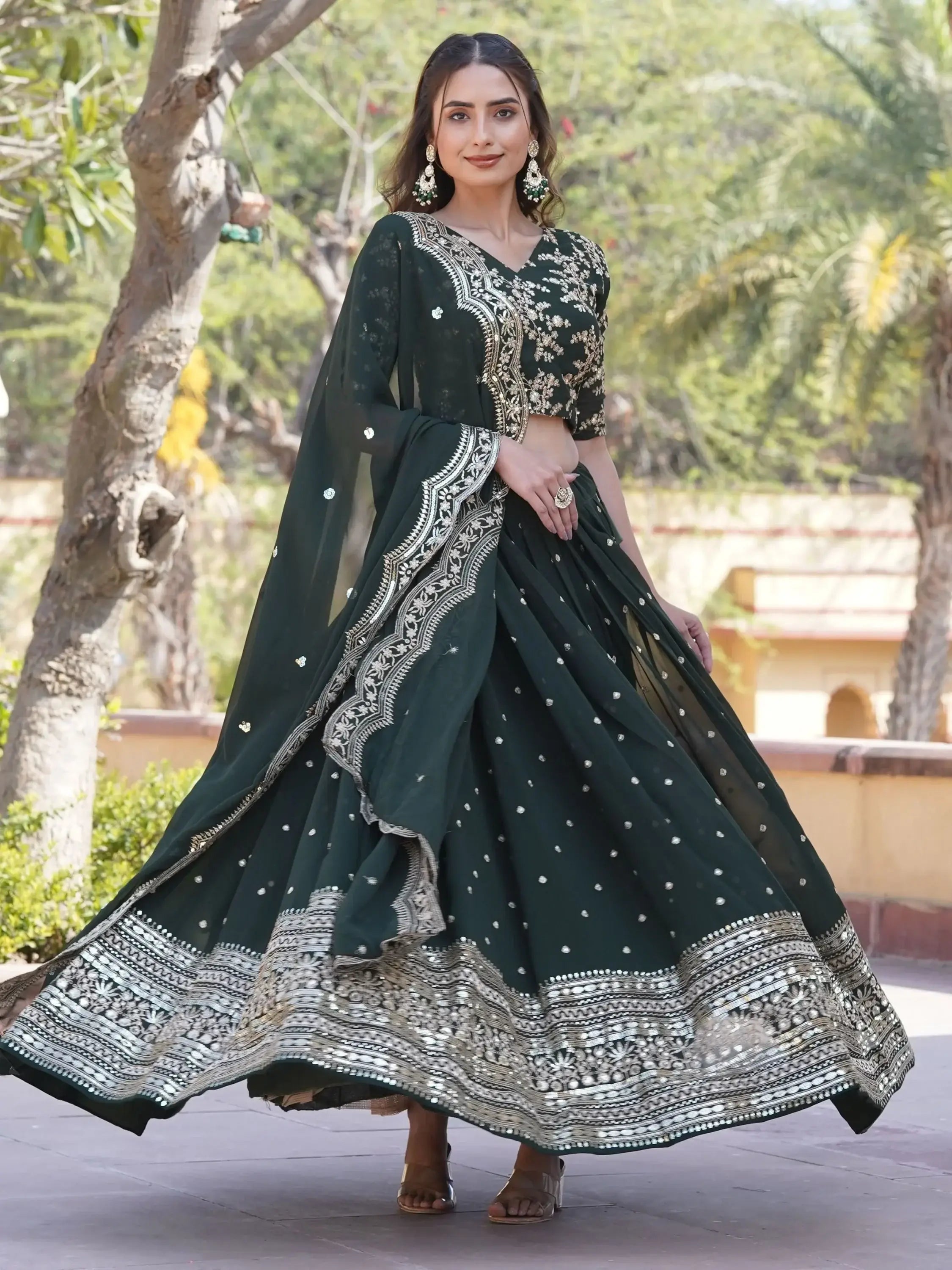 The dark green Georgette lehenga boasts a mesmerizing 3.5-meter flair, ensuring graceful movements with every step you take. Its exquisite sequin and embroidered work elevate its allure, adding a touch of opulence to your ensemble. Paired with a matching choli featuring heavy sequin work and multi-embroidered detailing, this ensemble exudes timeless beauty and refinement.