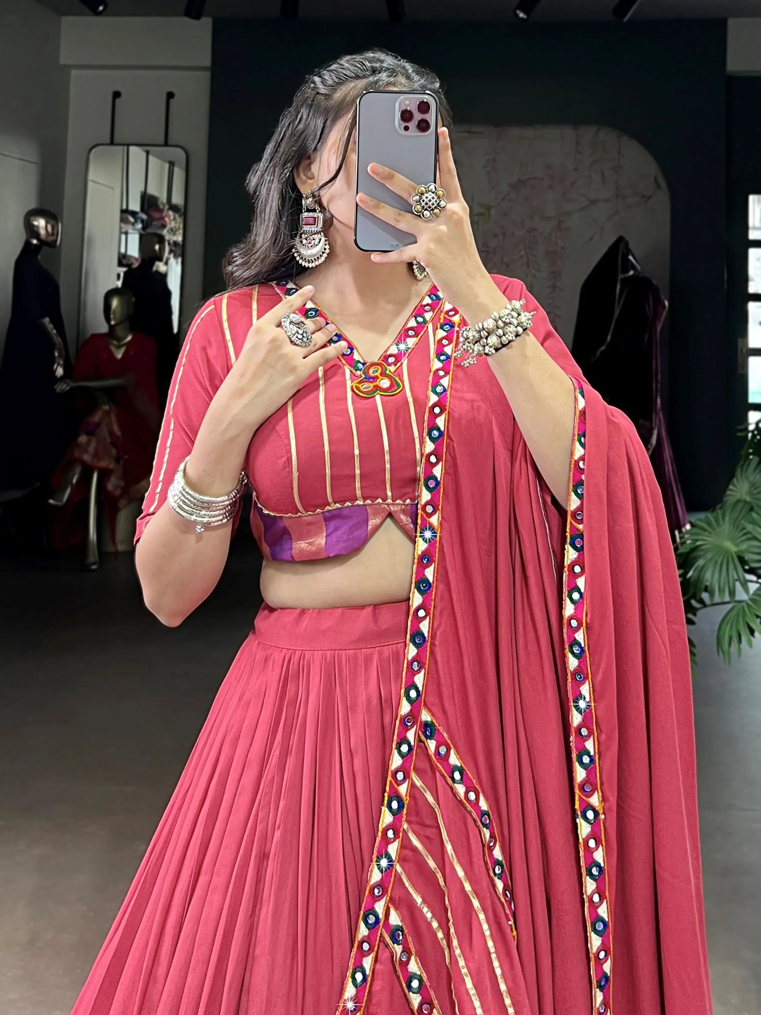 The lehenga is crafted from pure rayon fabric, ensuring a soft and comfortable drape. Designed with a flattering 41-inch length, it provides elegance with ease of movement.