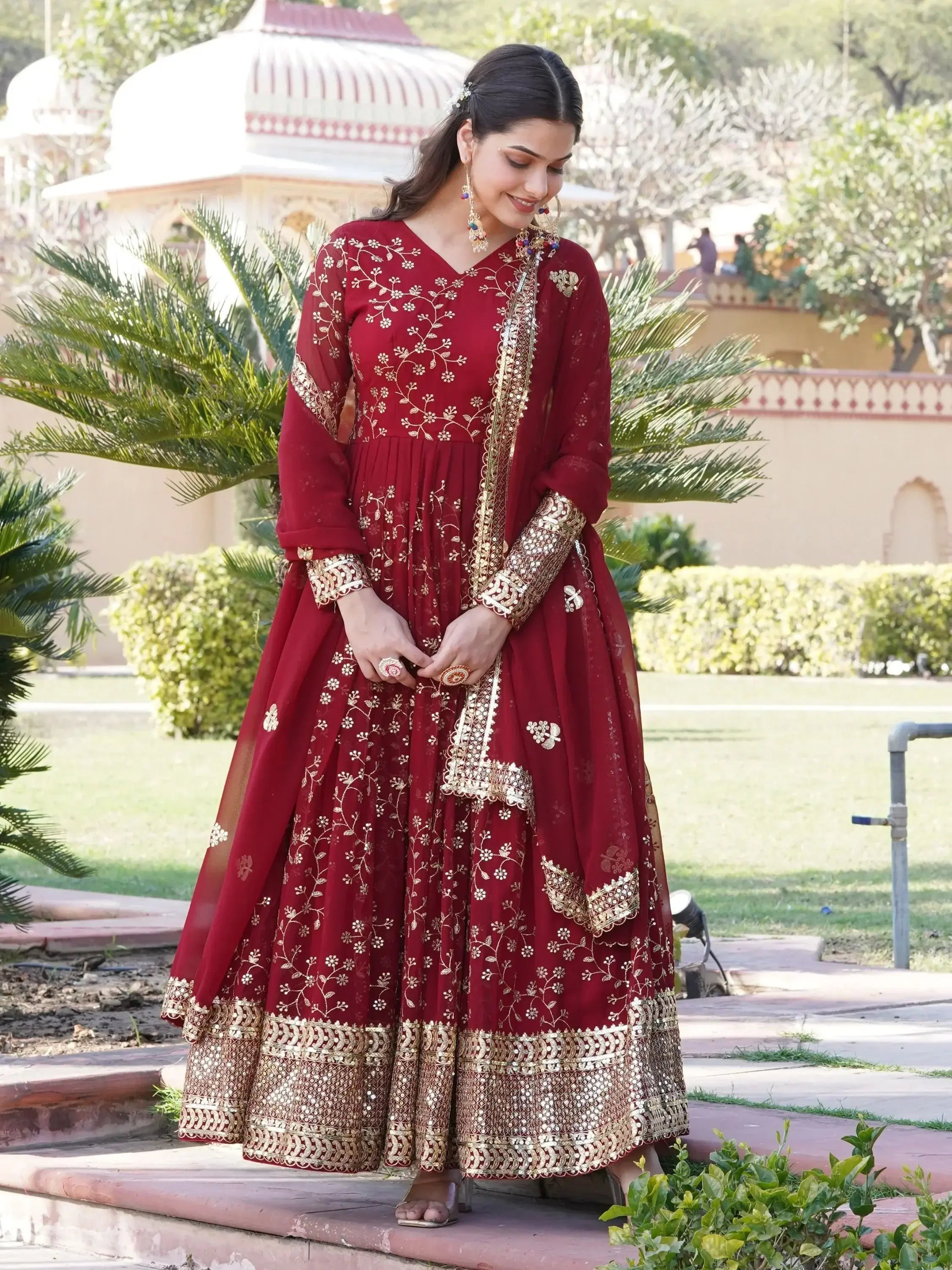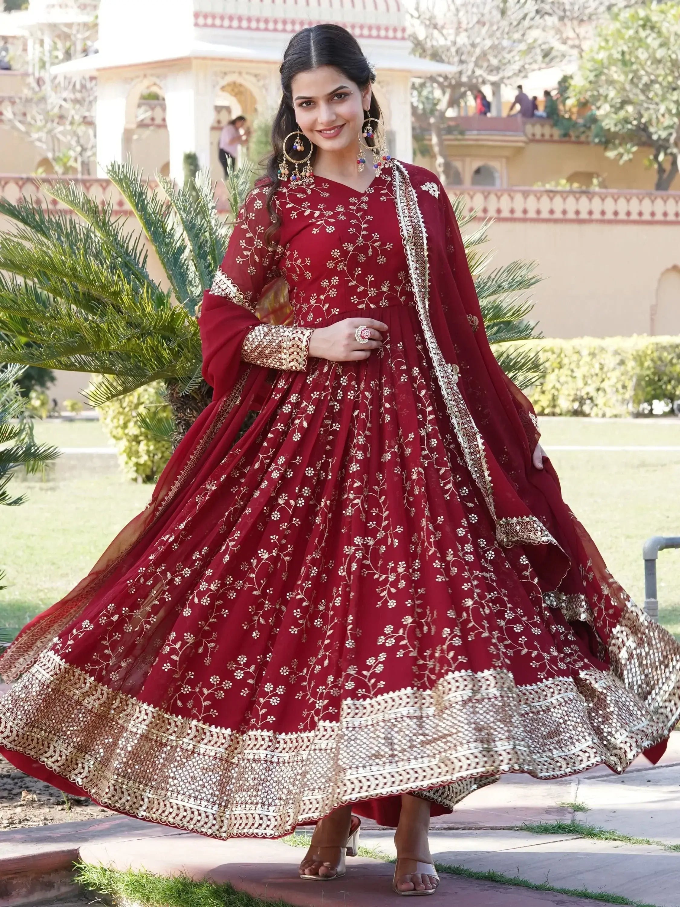 This maroon sequins georgette wedding wear gown with dupatta includes its high-quality georgette fabric, which is not only lightweight and comfortable to wear but also drapes beautifully on the body. The intricate sequin work and thread embroidery add a touch of glamour and sophistication, making this gown set a standout piece in your collection. The matching dupatta with designer lace work completes the look, adding a touch of elegance to your outfit.
