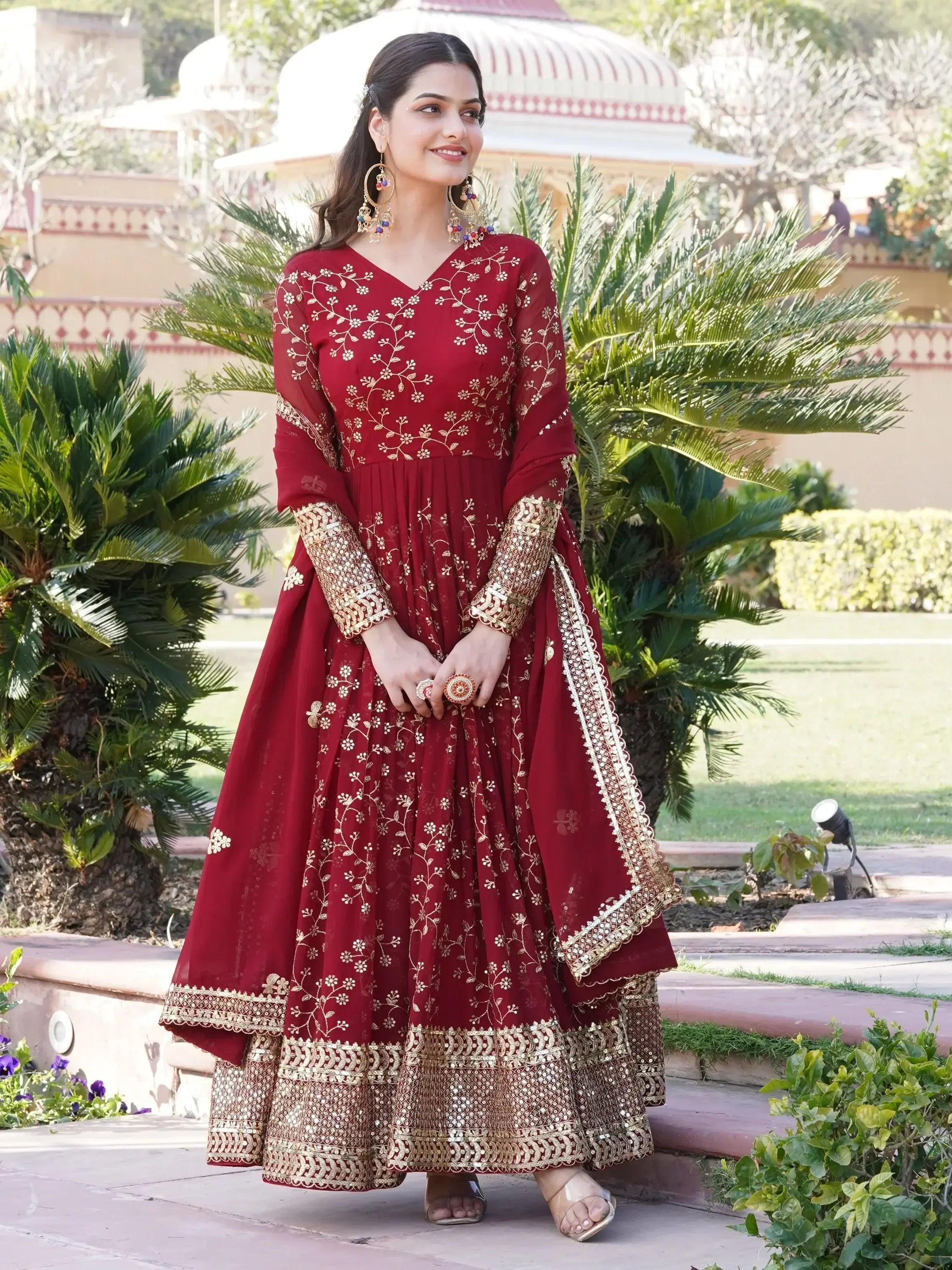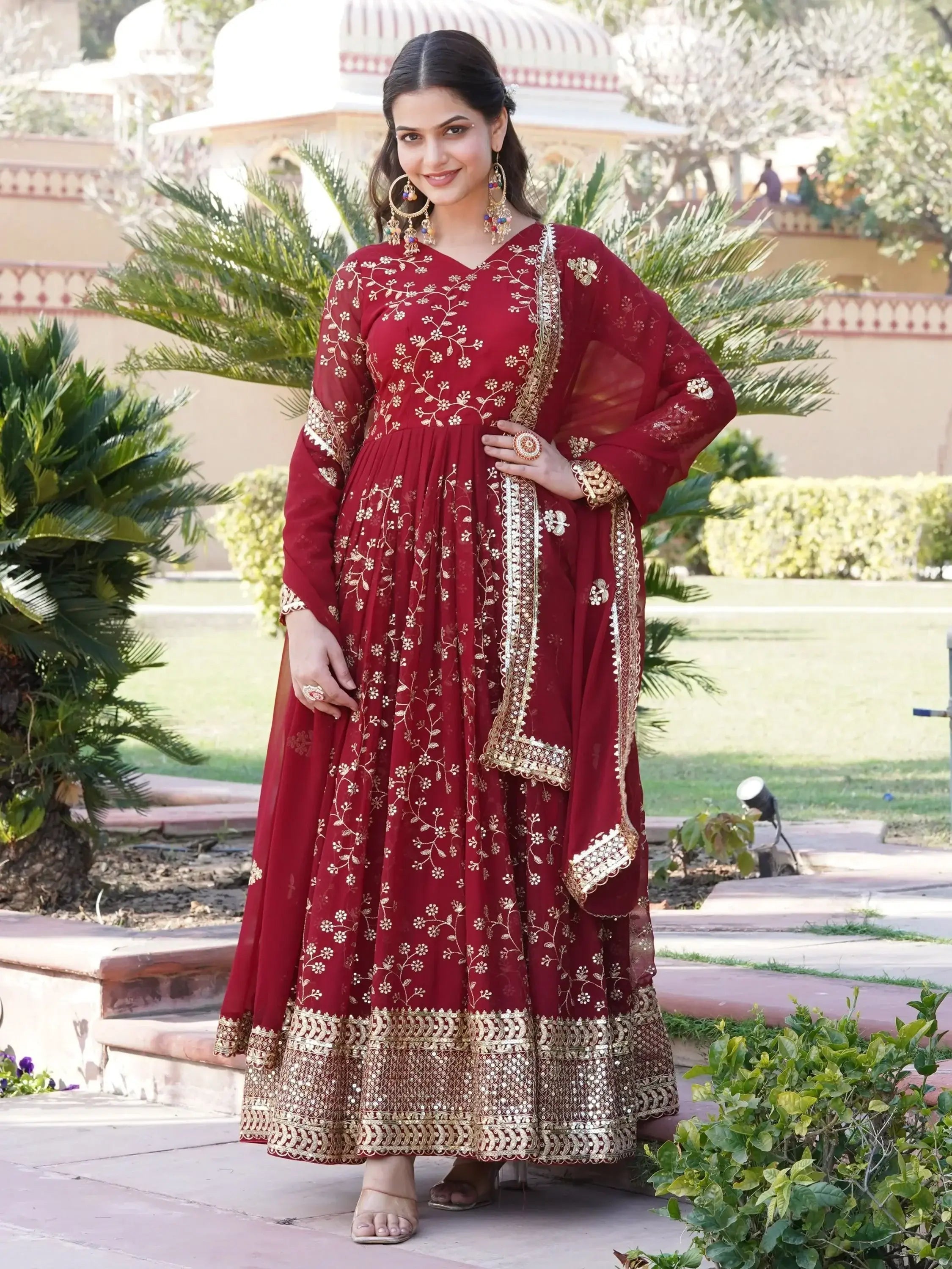 Glamorous Red Zari Embroidered Georgette Anarkali Gown With Dupatta