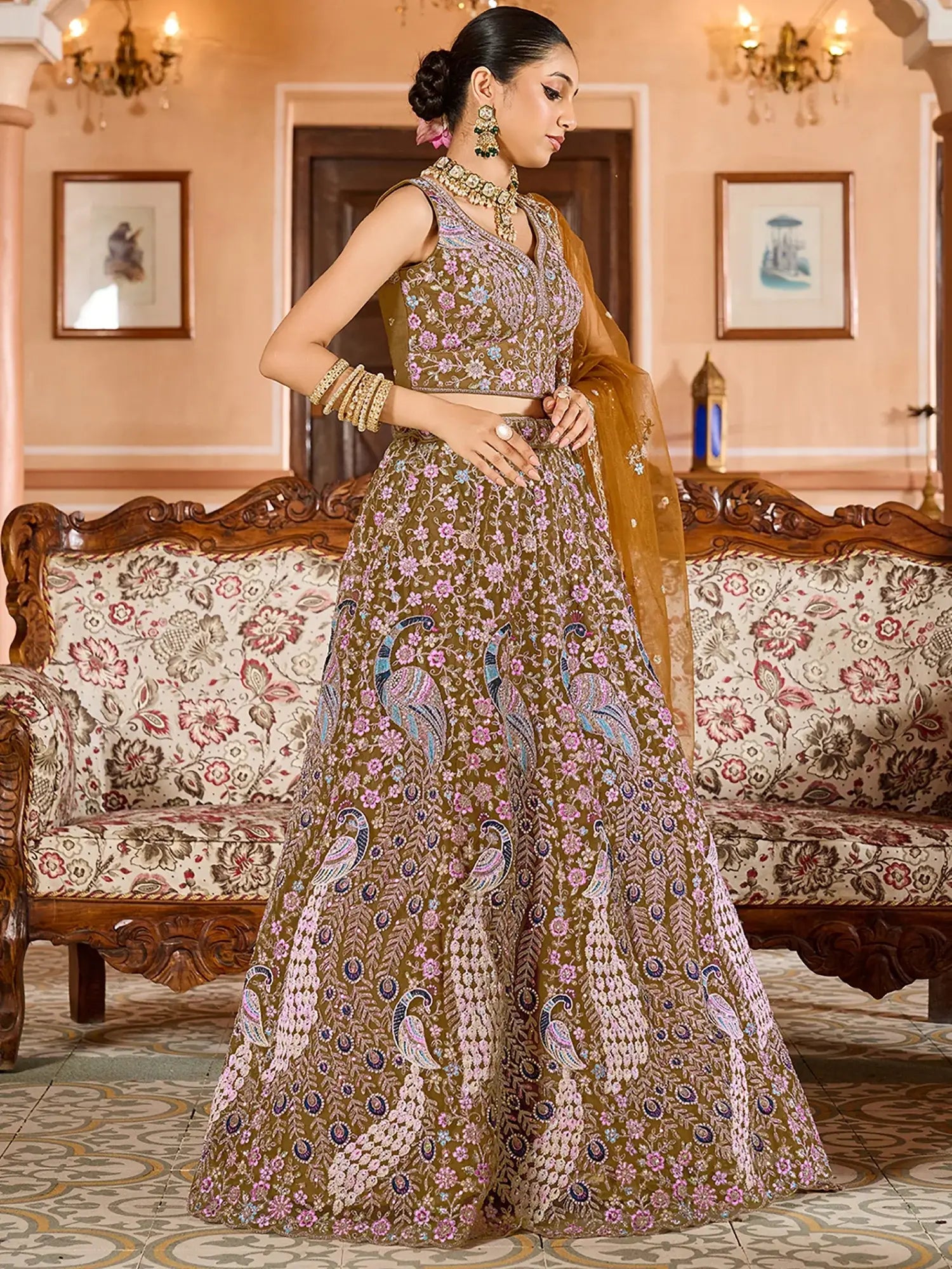 This stunning net lehenga features exquisite sequins and thread-embroidered work, giving it a luxurious and royal appeal. The intricate floral patterns and peacock motifs elevate the outfit with rich elegance.