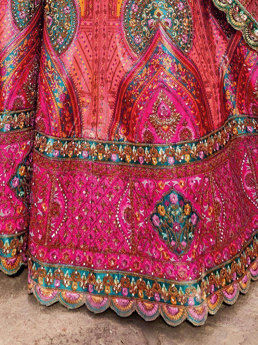 The lehenga is made from high-quality jacquard silk material, ensuring a luxurious and comfortable fit. With its pink color, it exudes femininity and grace, making it perfect for weddings, marriages, and other festive occasions.