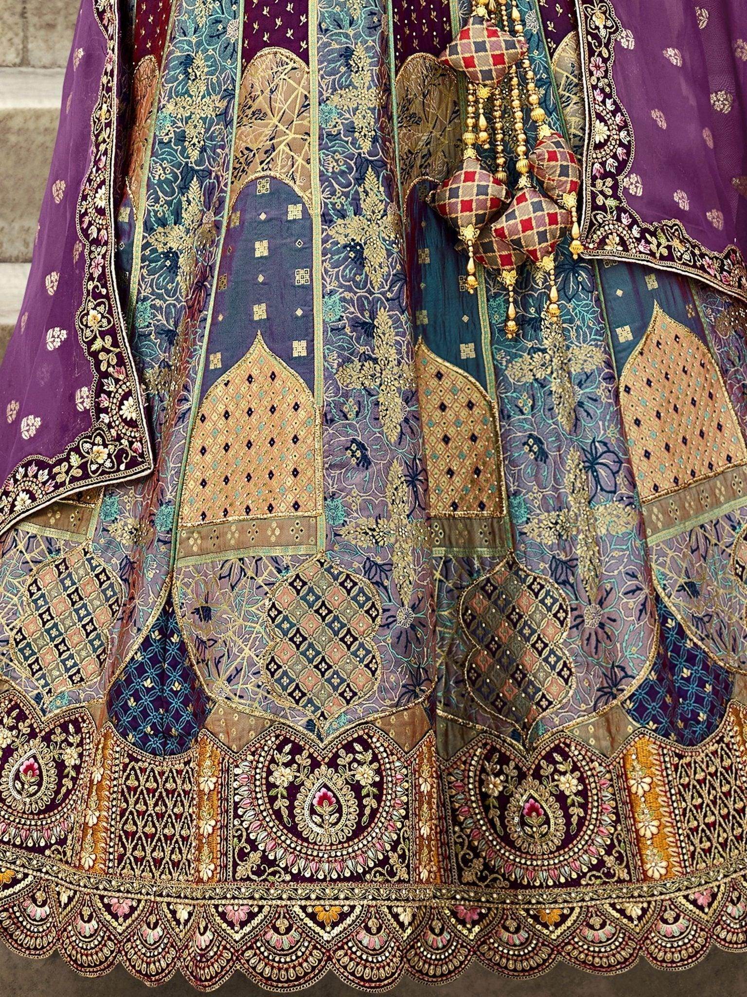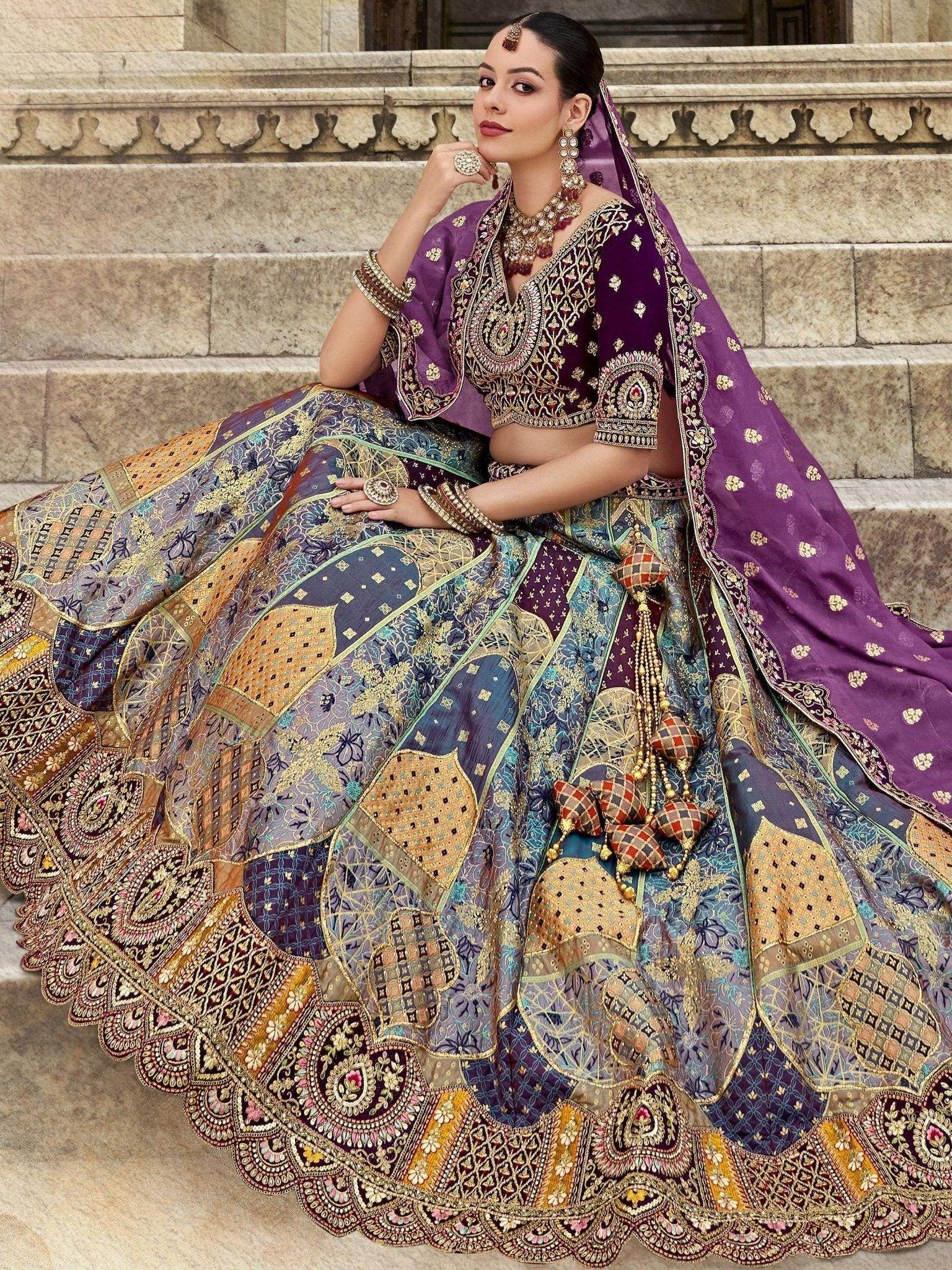 Immerse yourself in the lush allure of this exquisite purple Lehenga choli, a stunning embodiment of elegance and tradition. The multi-color Lehenga crafted from Banarasi silk, adorned with jarkan embellishments, sets a captivating tone for any festive occasion.
