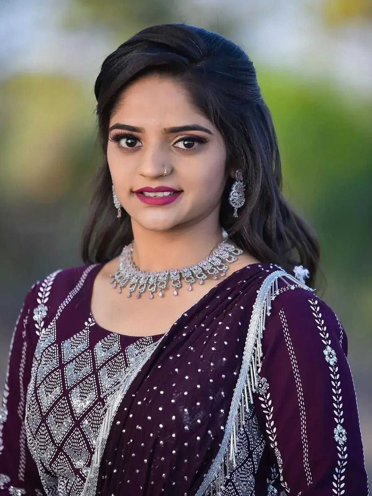 This lehenga choli set includes a purple georgette lehenga with sequins and thread embroidery work, a georgette choli with similar sequins and threadwork, and a georgette dupatta with heavy zari work. The fully stitched lehenga is available in sizes M, L, and XL, with a 3.50-meter flair for a graceful and flowy silhouette.