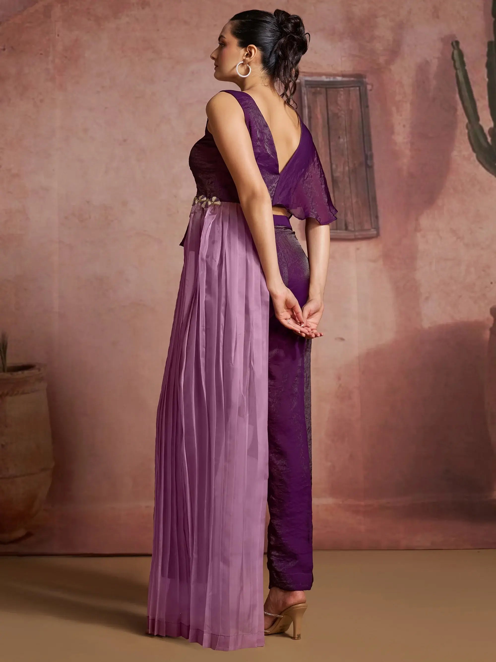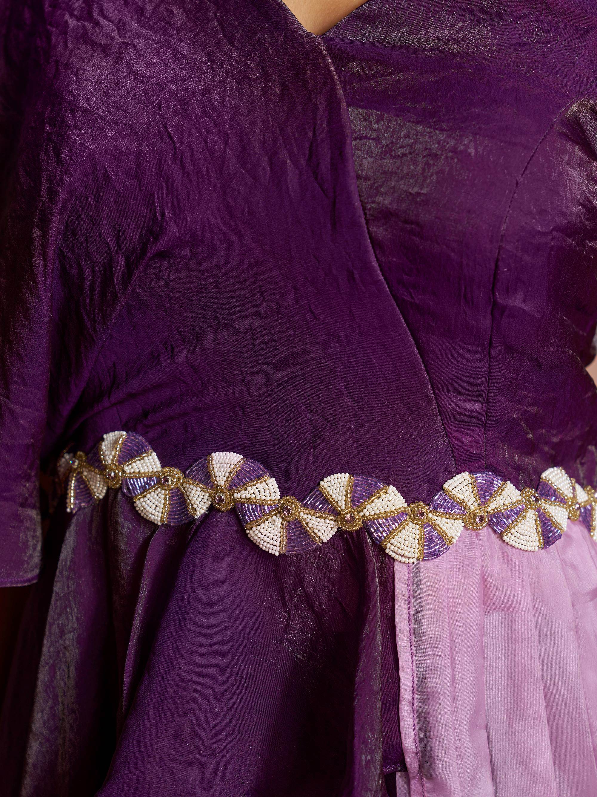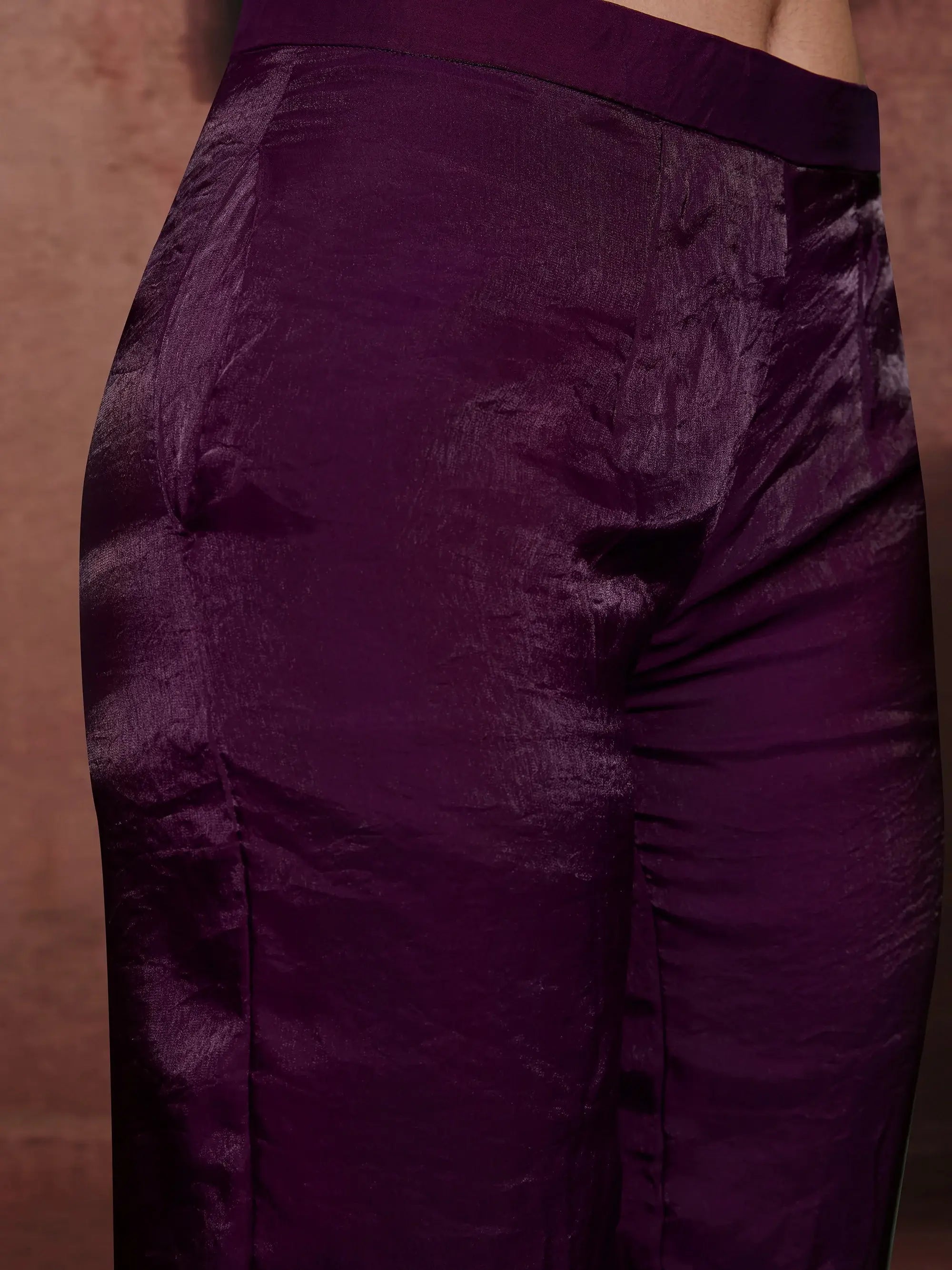 The top showcases digital printed work with a beautifully embellished waist belt that enhances the overall silhouette. The straight-fit pants in matching wine muslin silk offer a sleek and polished look perfect for modern festive styling.
