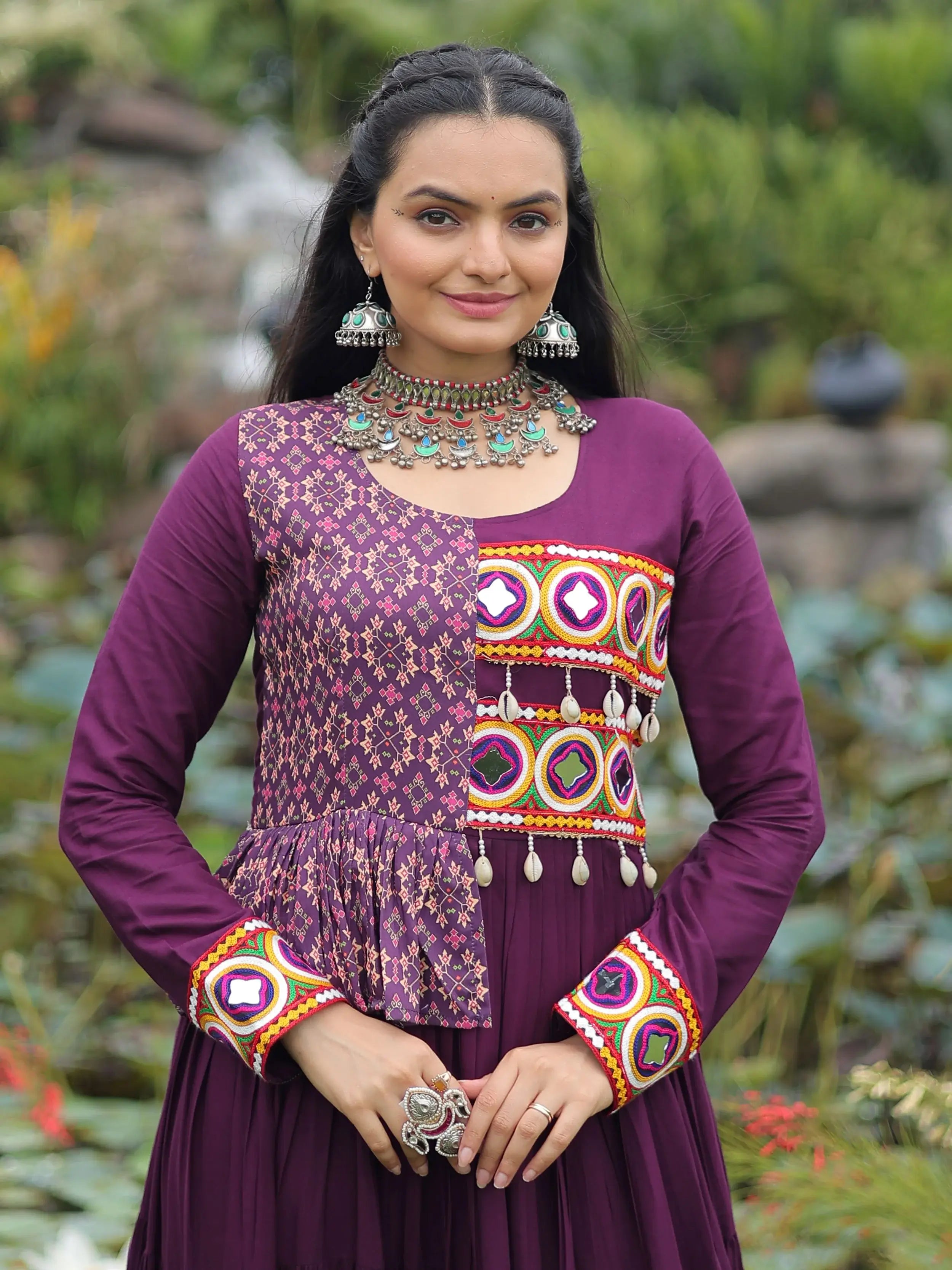 Shell embellishments, mirror work accents, and vibrant cuffs add a festive touch. A beautiful choice for Navratri nights or ethnic celebrations.