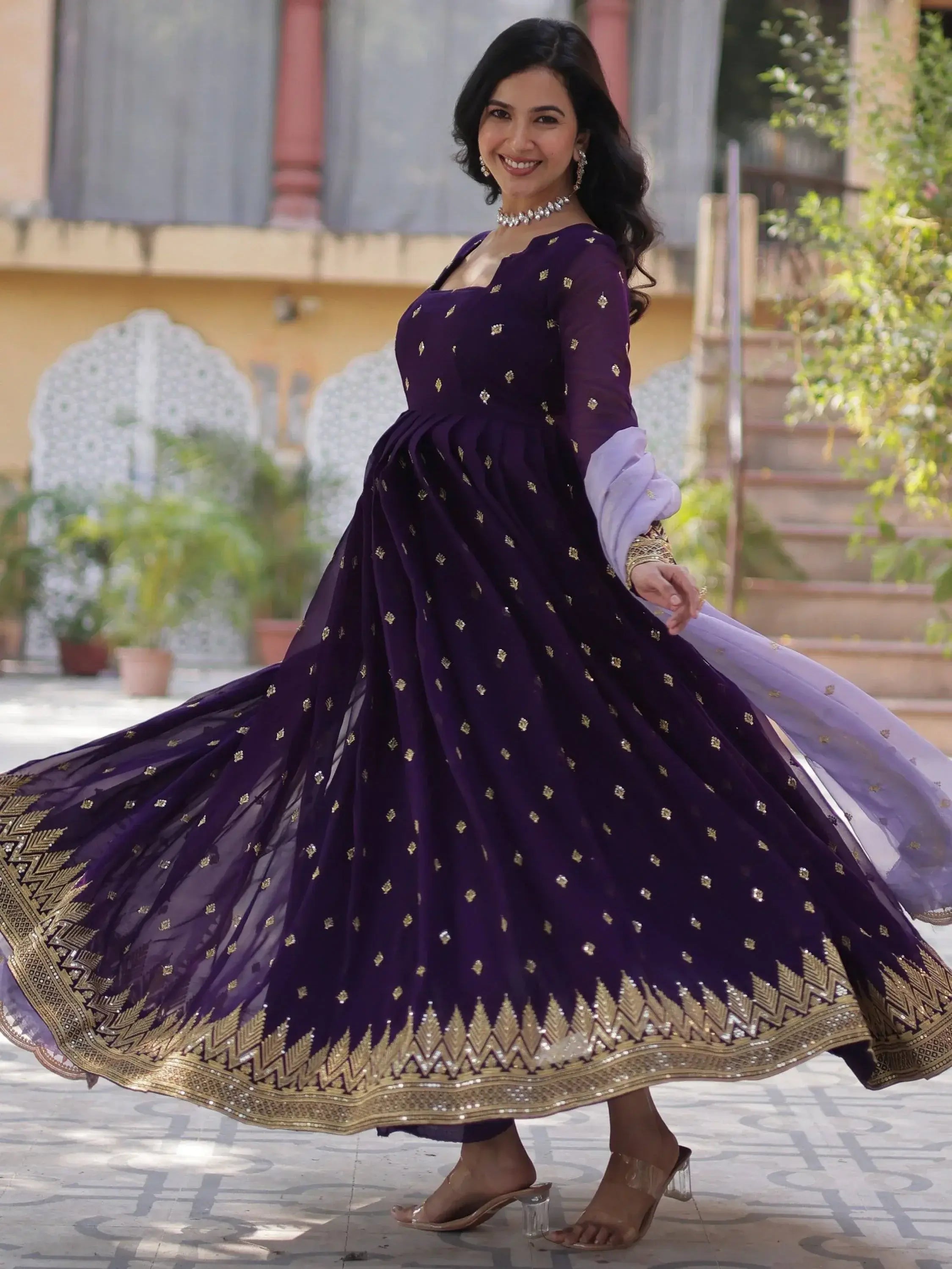 Step into effortless elegance with this fantastic purple georgette gown, perfect for festive and party functions. The rich purple tone combined with delicate sequins and zari embroidery creates a graceful and eye-catching look. Designed for those who love style with comfort, this gown brings a festive sparkle to every celebration.
