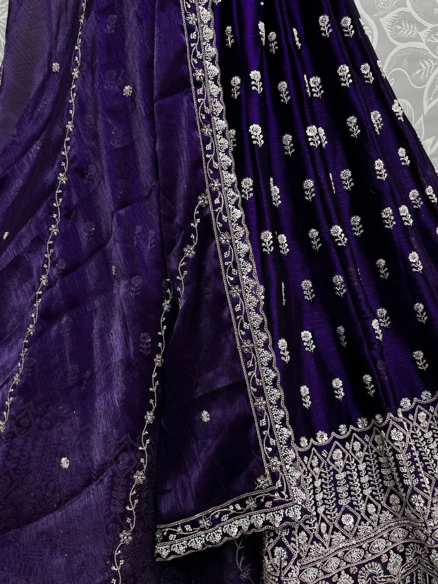 Elevate your ethnic wardrobe with our fantastic violet embroidered silk designer lehenga choli with a dupatta. This stunning ensemble features a violet silk lehenga adorned with exquisite sequin, motif handwork, khatali handwork, dori embroidered work, paired with a matching silk choli and dupatta.