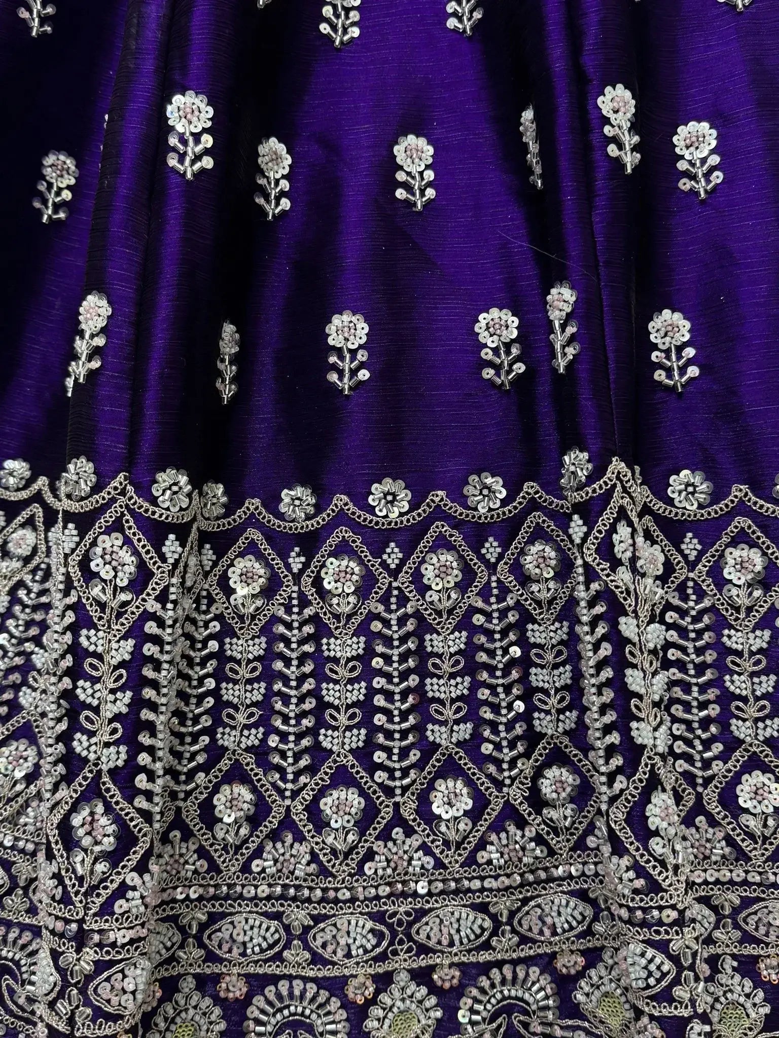 The matching silk dupatta with sequin work, handwork, and beautiful lace detailing and butta all over completes the look, adding a touch of sophistication to your overall ensemble. Indulge in the beauty of our fantastic violet embroidered silk designer lehenga choli with dupatta and exude sophistication and style at your next special event.