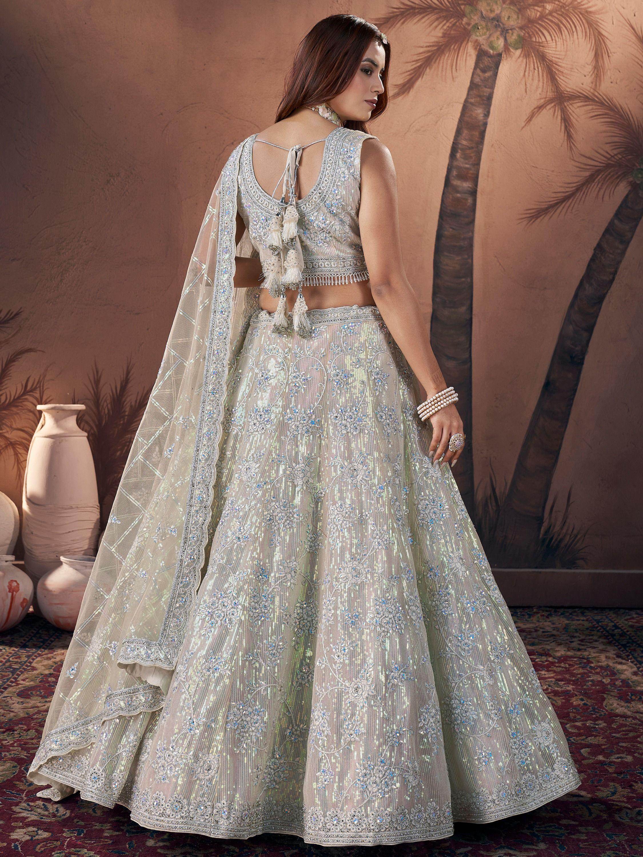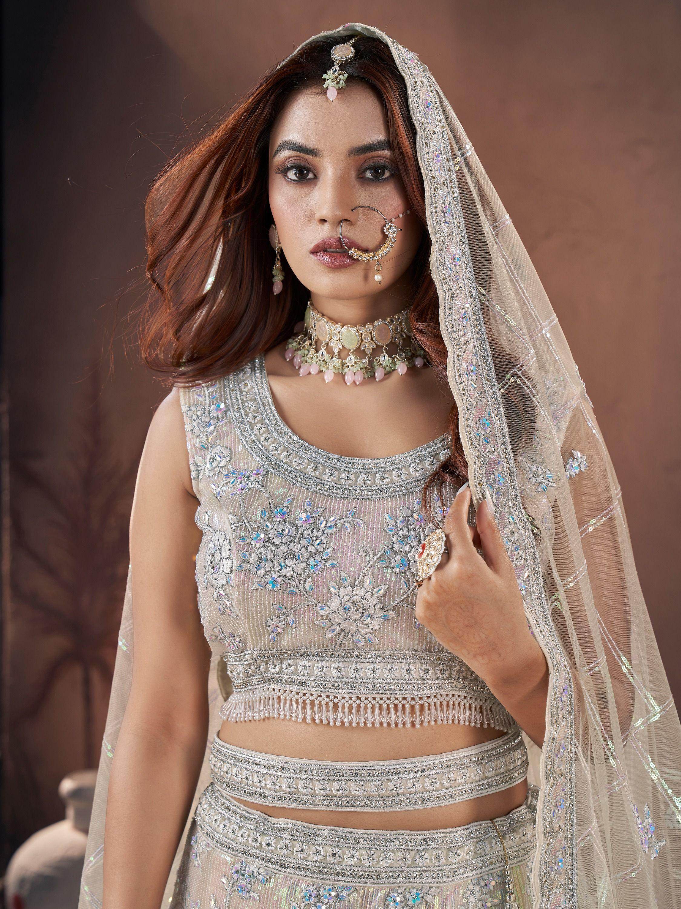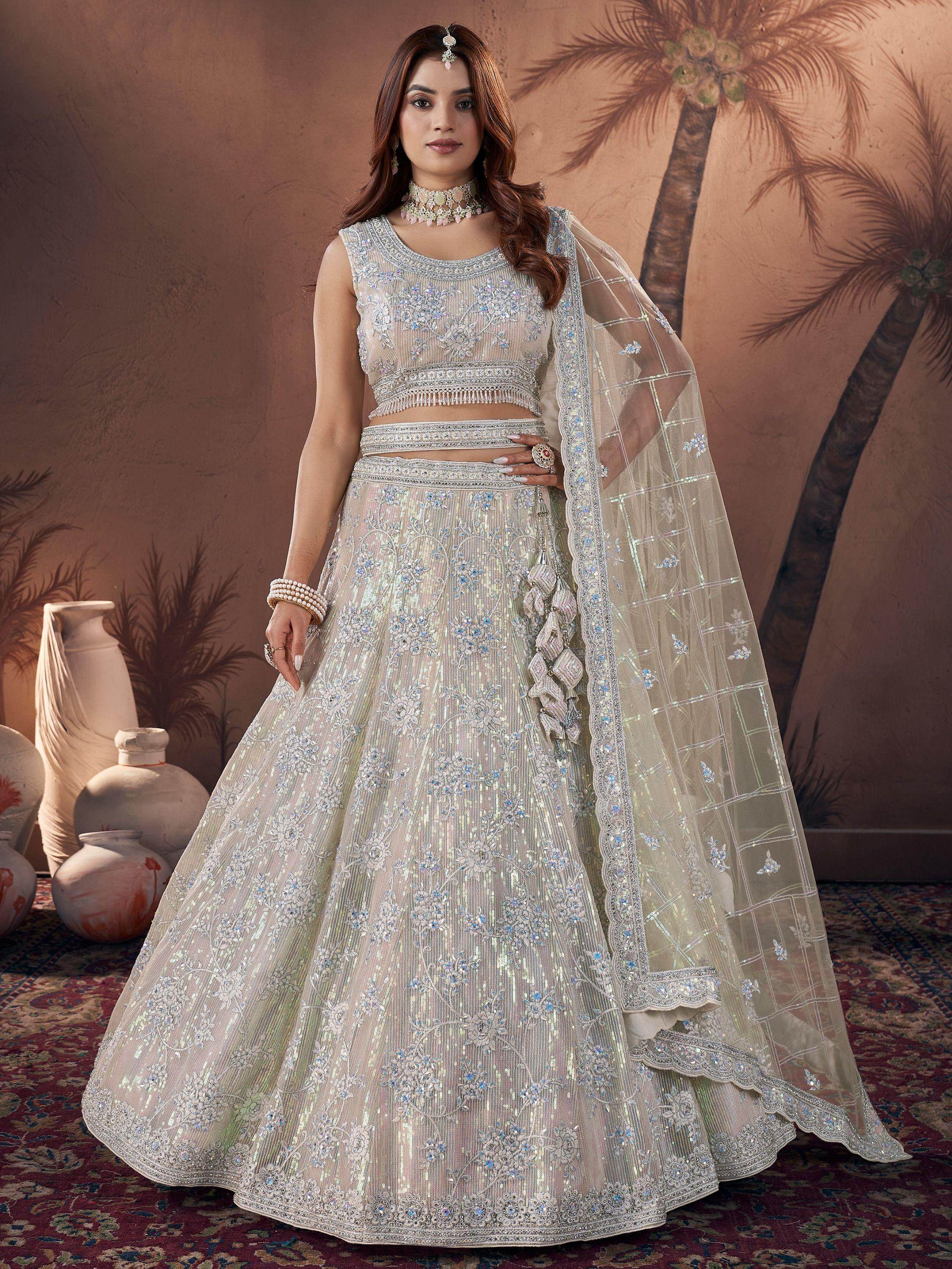 The off-white color net material lehenga is embellished with exquisite zarkan work, sequin work, cutwork, and khatli work, and adorned with attractive latkans. This stunning ensemble is perfect for weddings, receptions, engagements, and all special occasions where you desire to radiate grace and charm. Crafted from luxurious net material, the lehenga boasts intricate detailing that adds a touch of opulence to its aesthetic.