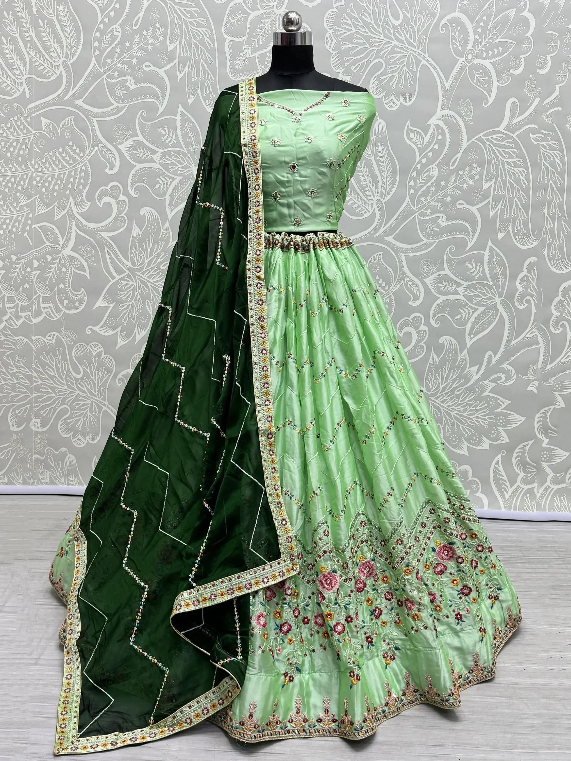 Pista Green Dori Thread Embroidered Net Wedding Lehenga Choli