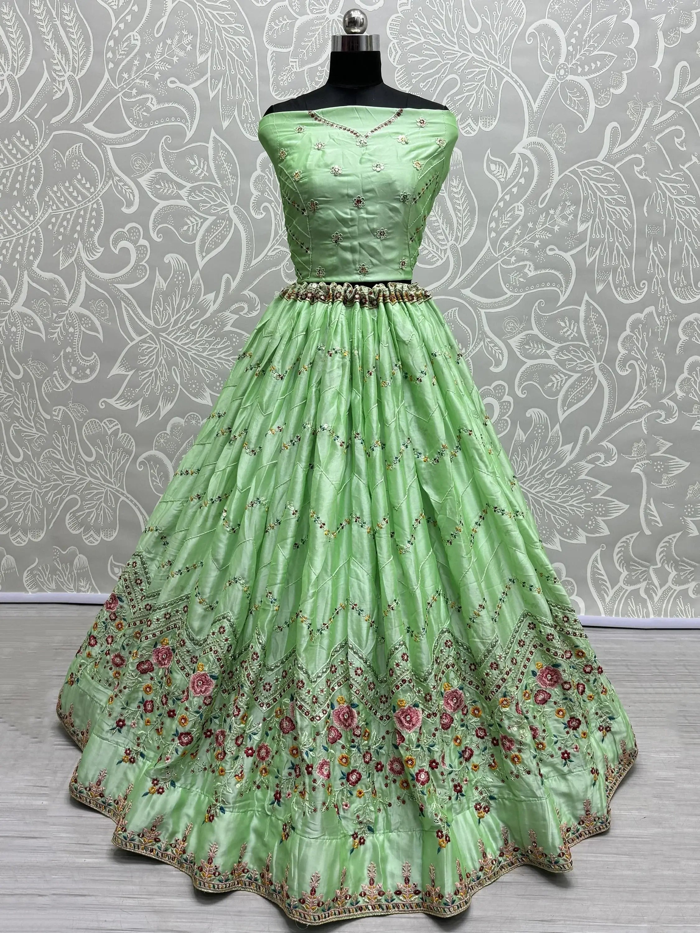 The "fascinating light green thread-work silk lehenga choli with dupatta" is a must-have in every woman's ethnic wear collection. With its beautiful design, high-quality silk fabric, and intricate detailing, this outfit is sure to turn heads and make you feel like royalty on any occasion. Don't miss out on this timeless piece that will make you the center of attention wherever you go. Shop now and experience the epitome of traditional craftsmanship and modern style.