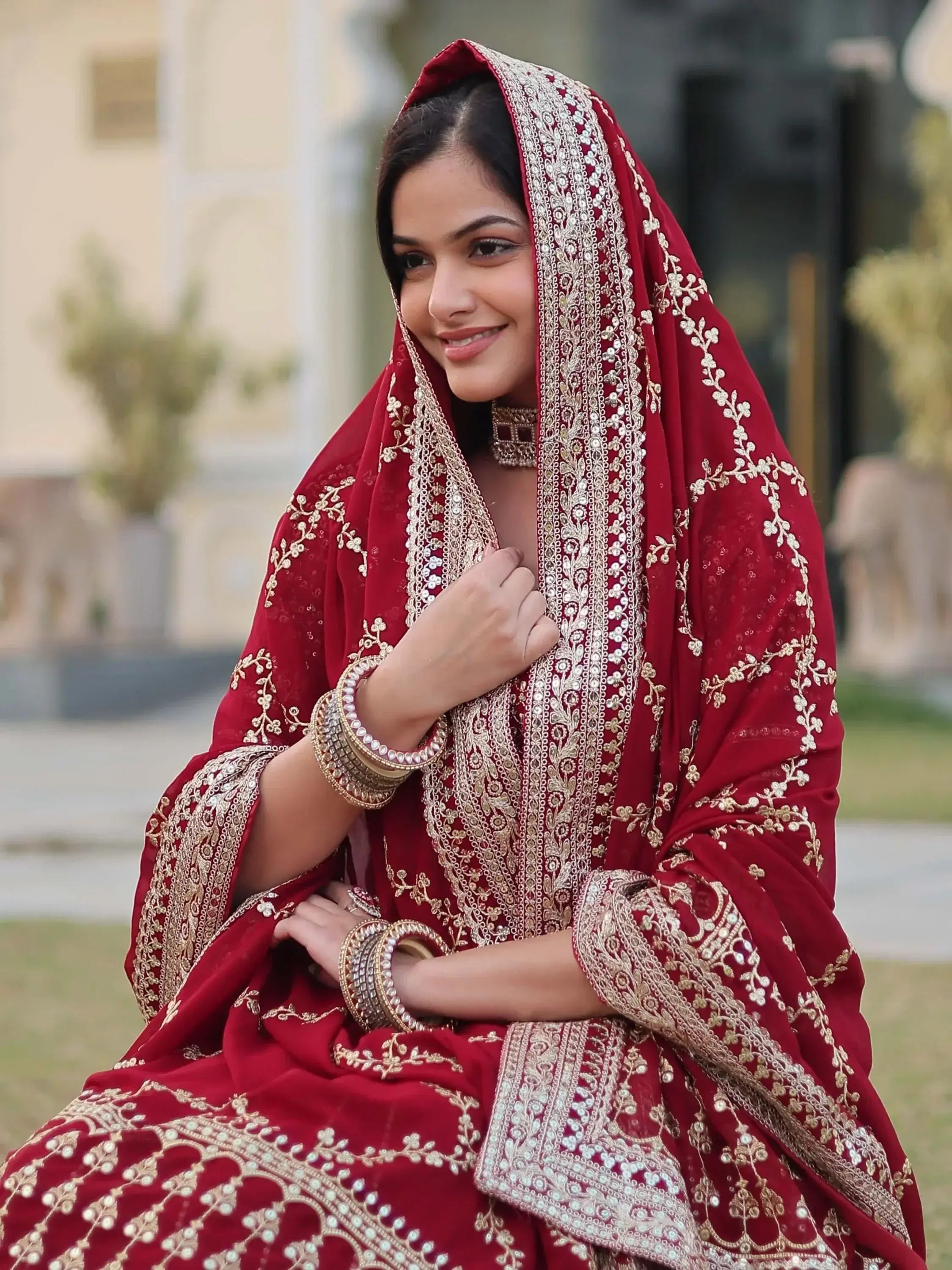 Introducing our stunning "fascinating maroon embroidered georgette wedding wear lehenga choli" that is sure to make you stand out on any special occasion.