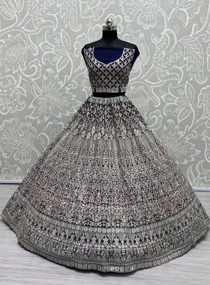 Introducing the fascinating navy blue embroidered net reception wear lehenga choli, a stunning piece that is sure to make you the center of attention at any reception or engagement event. This beautiful lehenga is made from a high-quality navy blue heavy net material, which gives it a luxurious and elegant look.