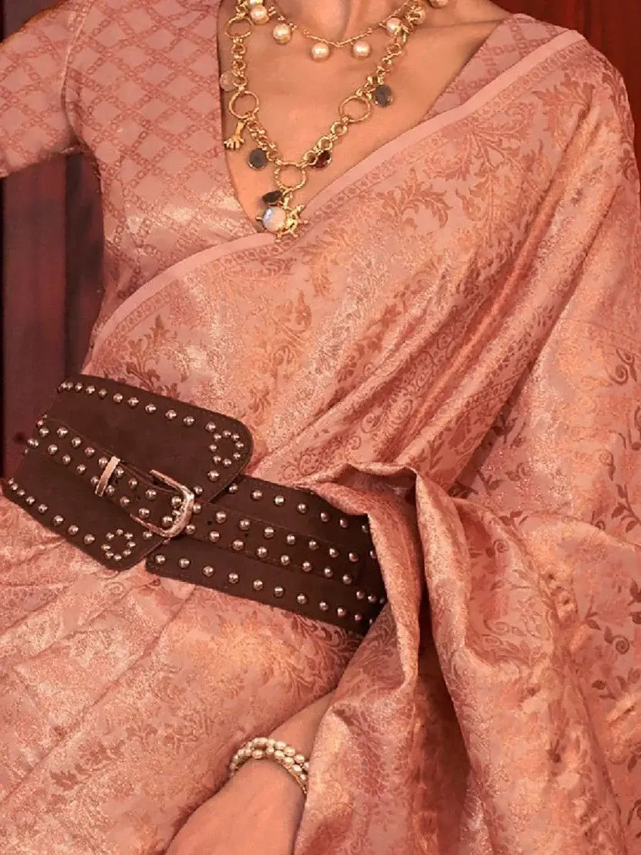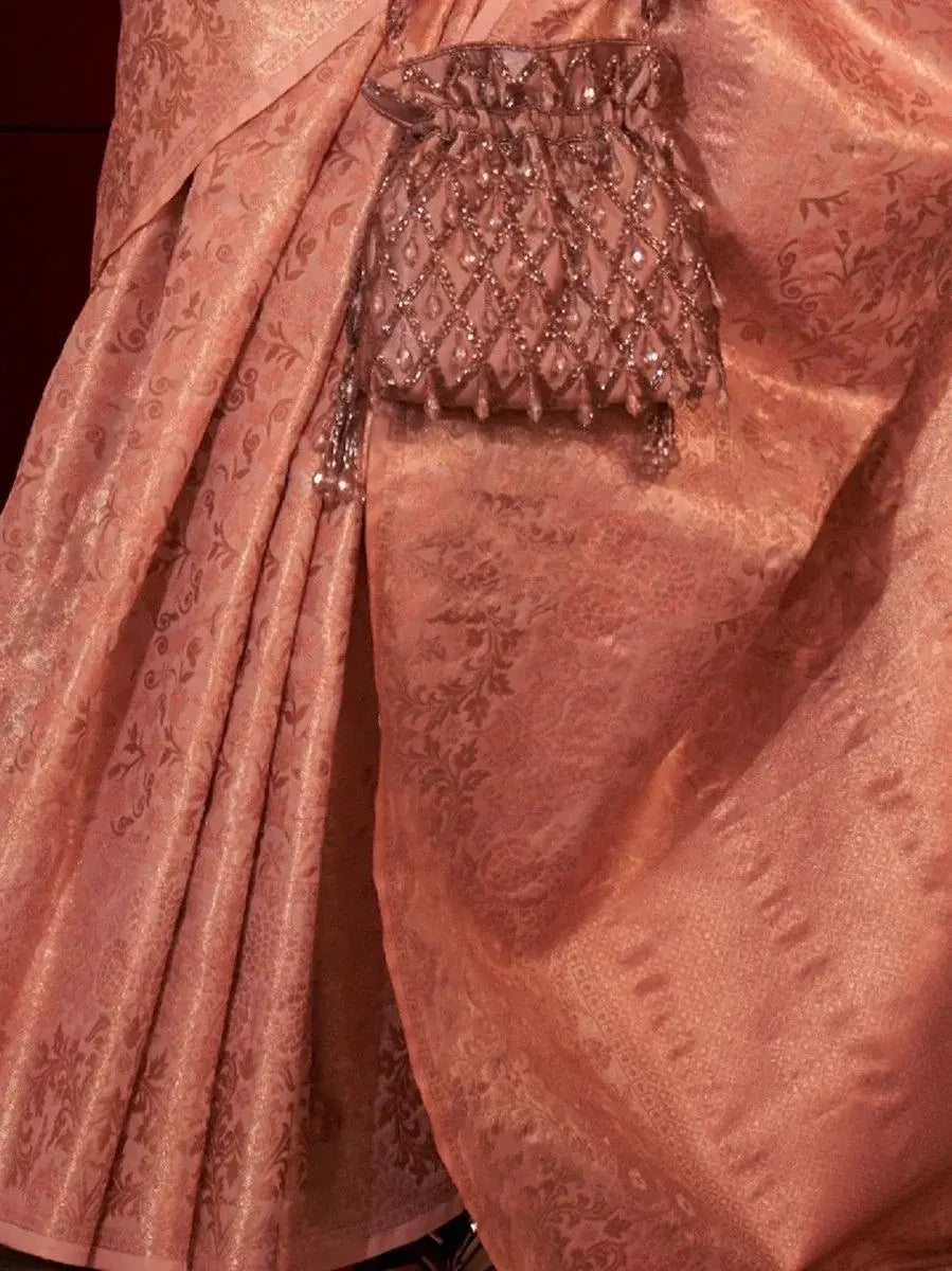 The fascinating peach zari woven silk reception wear saree with blouse is a regular-sized saree designed for women. The half sleeves and V-shaped neck of the blouse add a contemporary twist to this traditional attire.