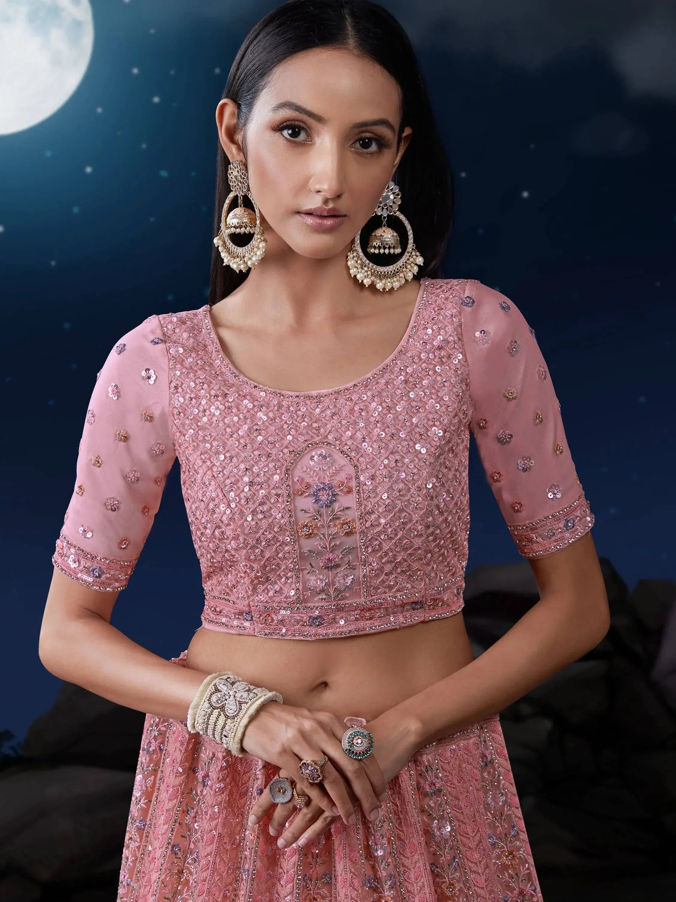 Introducing our "fascinating pink sequins net engagement wears lehenga choli", a stunning outfit that will make you the center of attention at any special occasion. This beautiful pink lehenga is made from exquisite net material and adorned with intricate dori work, sequin work, thread work, zari work, and zarkan work.