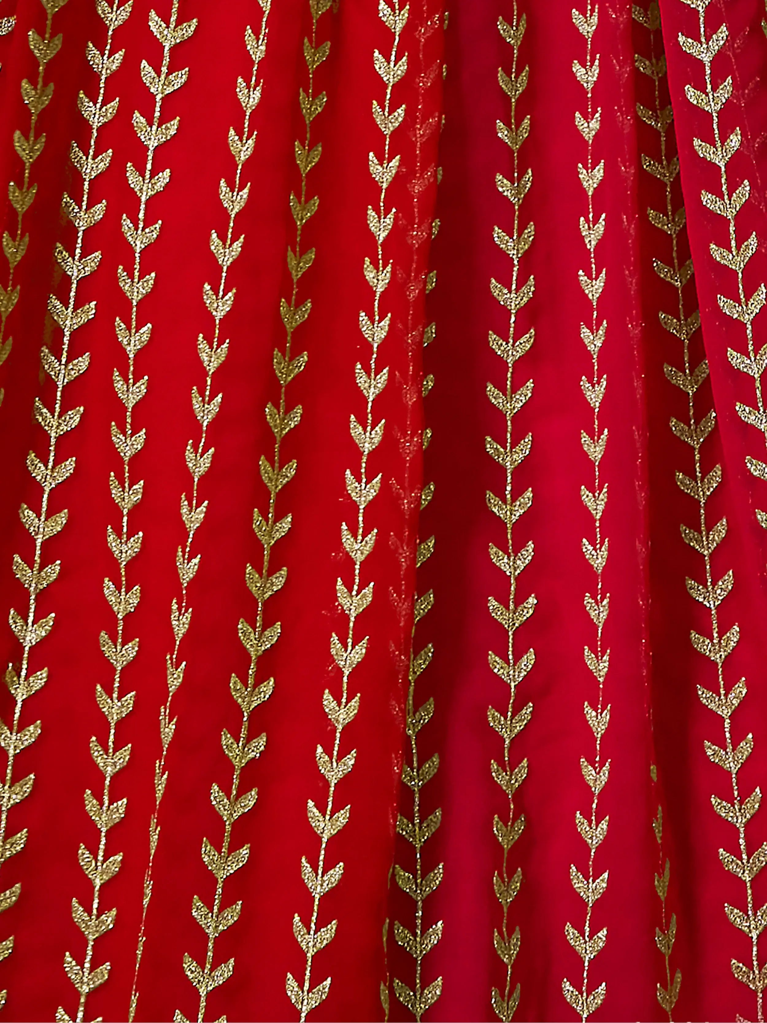 Its vibrant red color radiates elegance and adds a touch of glamour to your overall look. The georgette material used in its construction guarantees a lightweight and comfortable feel, allowing you to move with ease and grace.