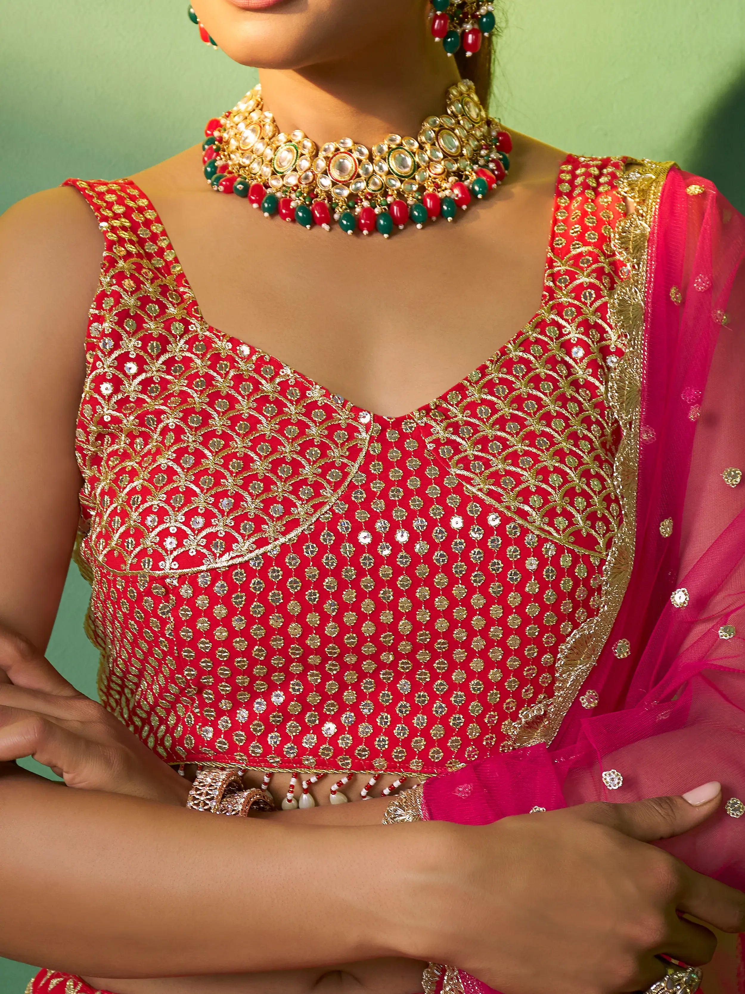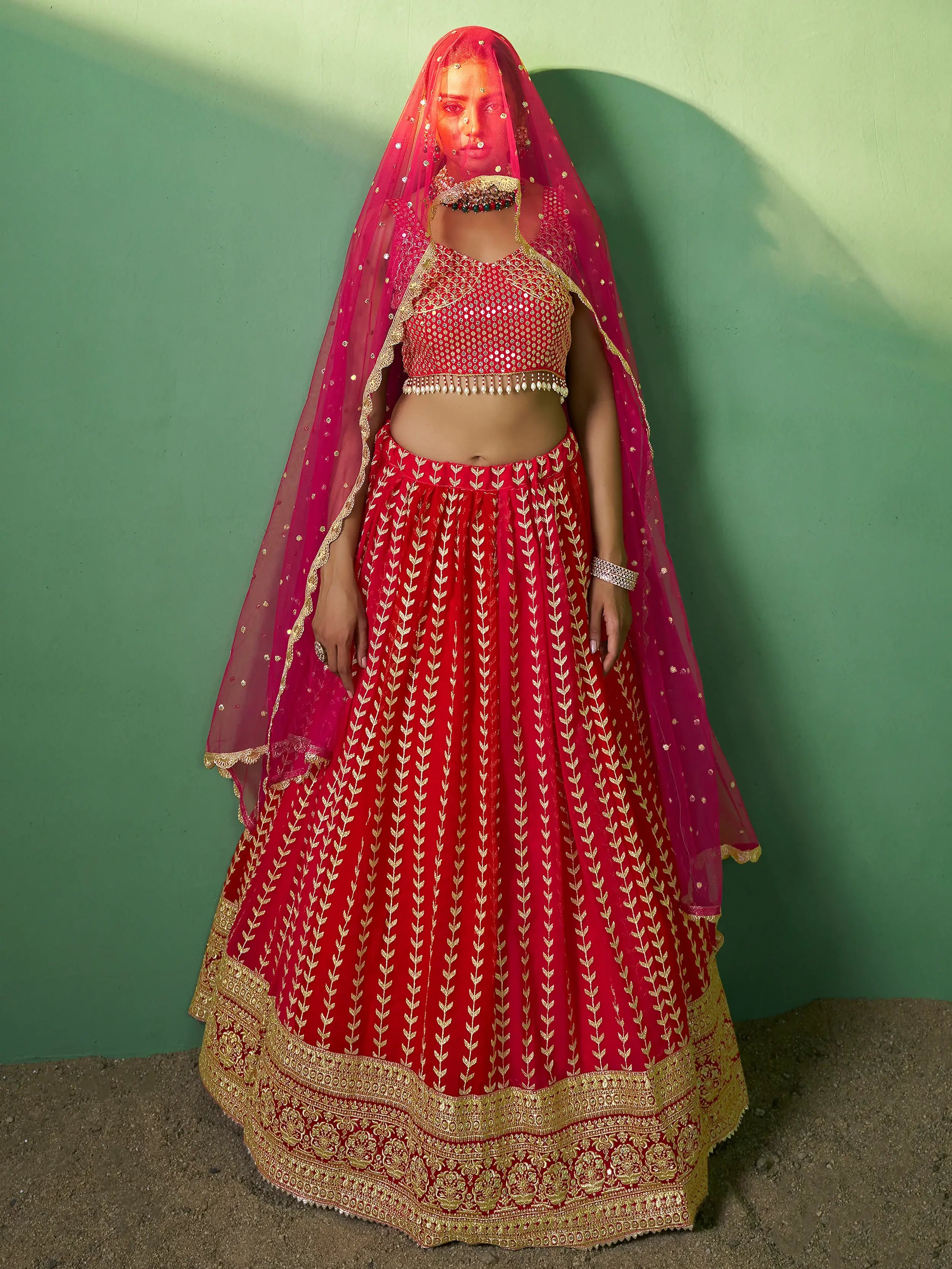 This red wedding lehenga choli is semi-stitched up to 42 inches, providing flexibility in terms of size. The choli material is fully unstitched, giving you the freedom to design it to your liking.