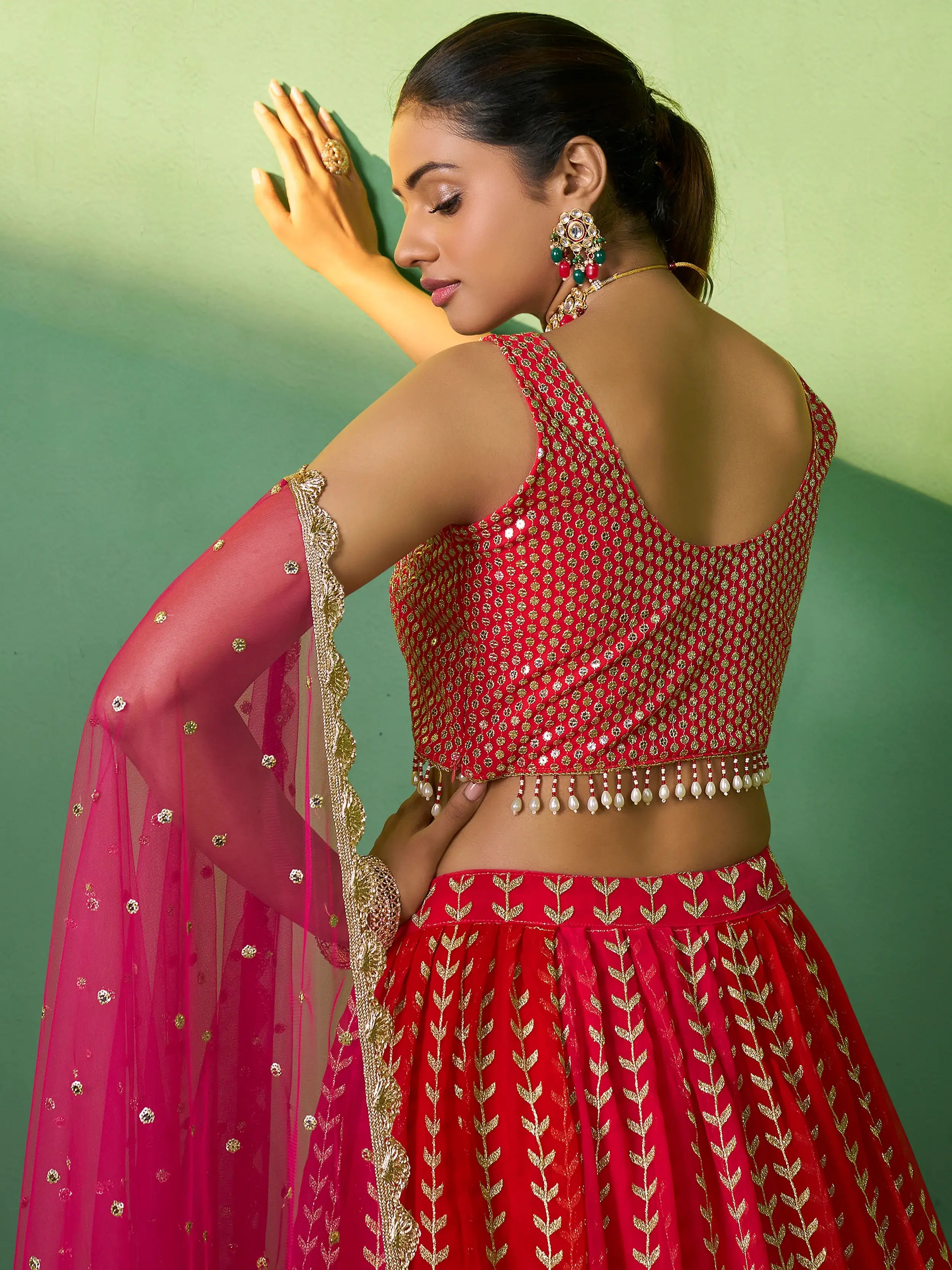 The "fascinating red sequins georgette wedding wear lehenga choli" is a masterpiece that combines elegance, craftsmanship, and style. With its sequin and embroidery work, it will undoubtedly make you feel like a true princess. The lightweight georgette material, along with its vibrant red color, further adds to its charm. Whether it is a wedding, reception, or engagement, this lehenga choli is a perfect choice for any special occasion.
