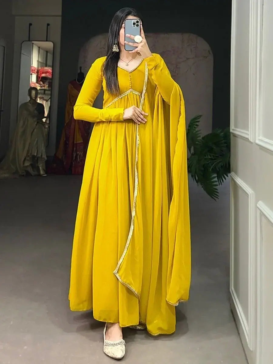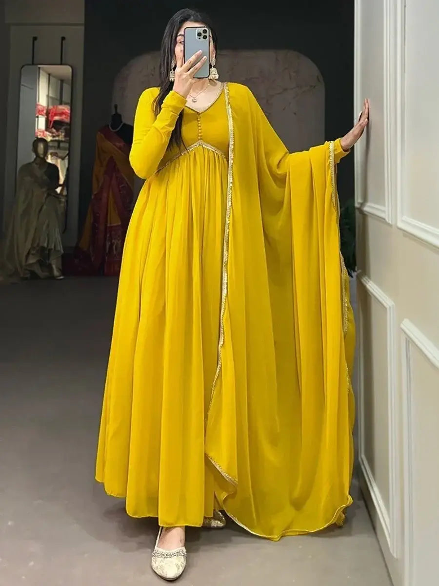 our fascinating yellow georgette festival wear a plain gown with a dupatta is the perfect addition to your wardrobe. Its timeless elegance combined with modern embellishments makes it a versatile choice for various occasions. Elevate your style and make a statement with this stunning gown.