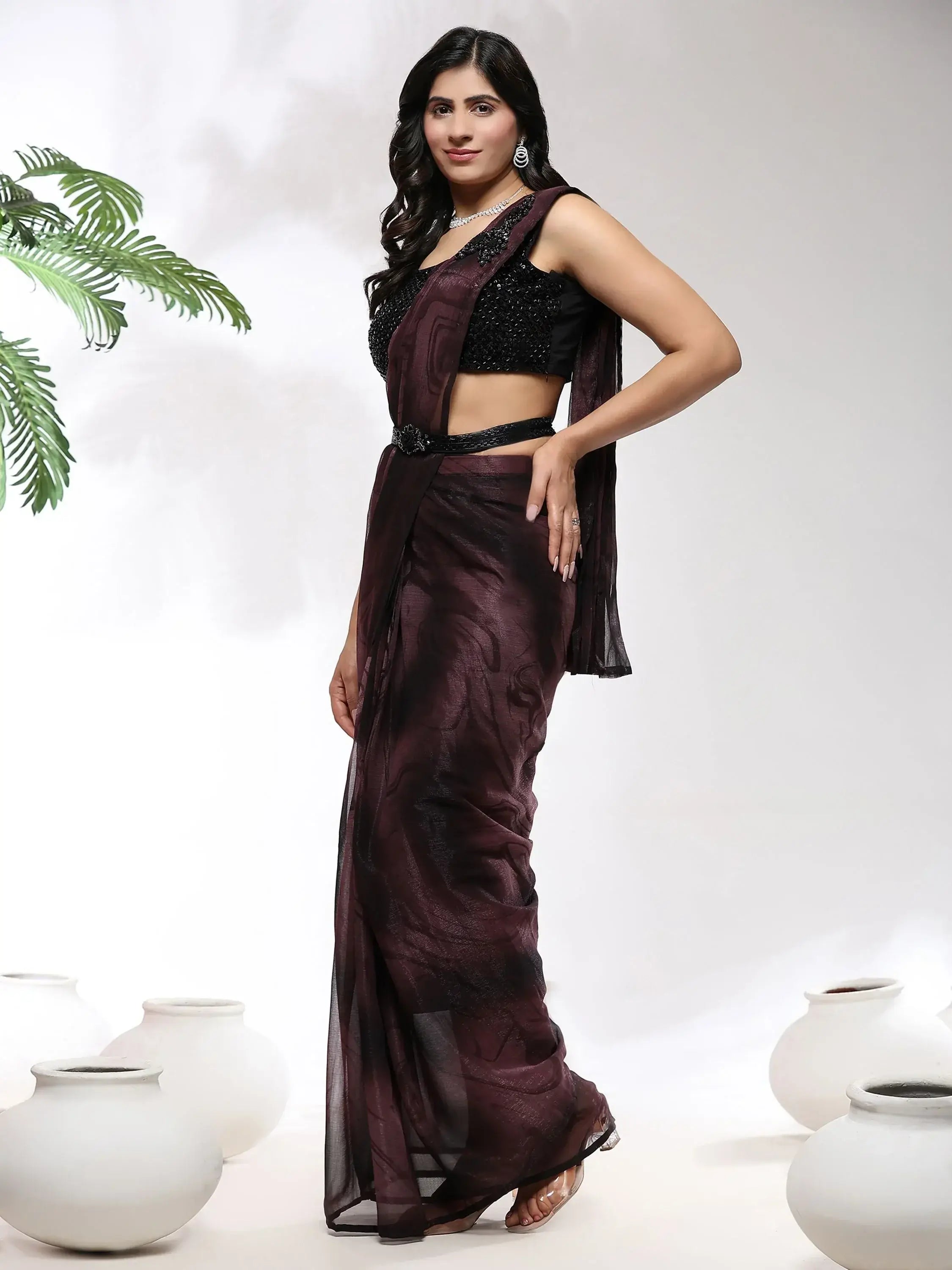 Step into the spotlight with this elegant wine satin pre-stitched saree, designed to make a lasting impression. The rich maroon color and luxurious satin fabric enhance your festive look, making it ideal for a range of special occasions.
