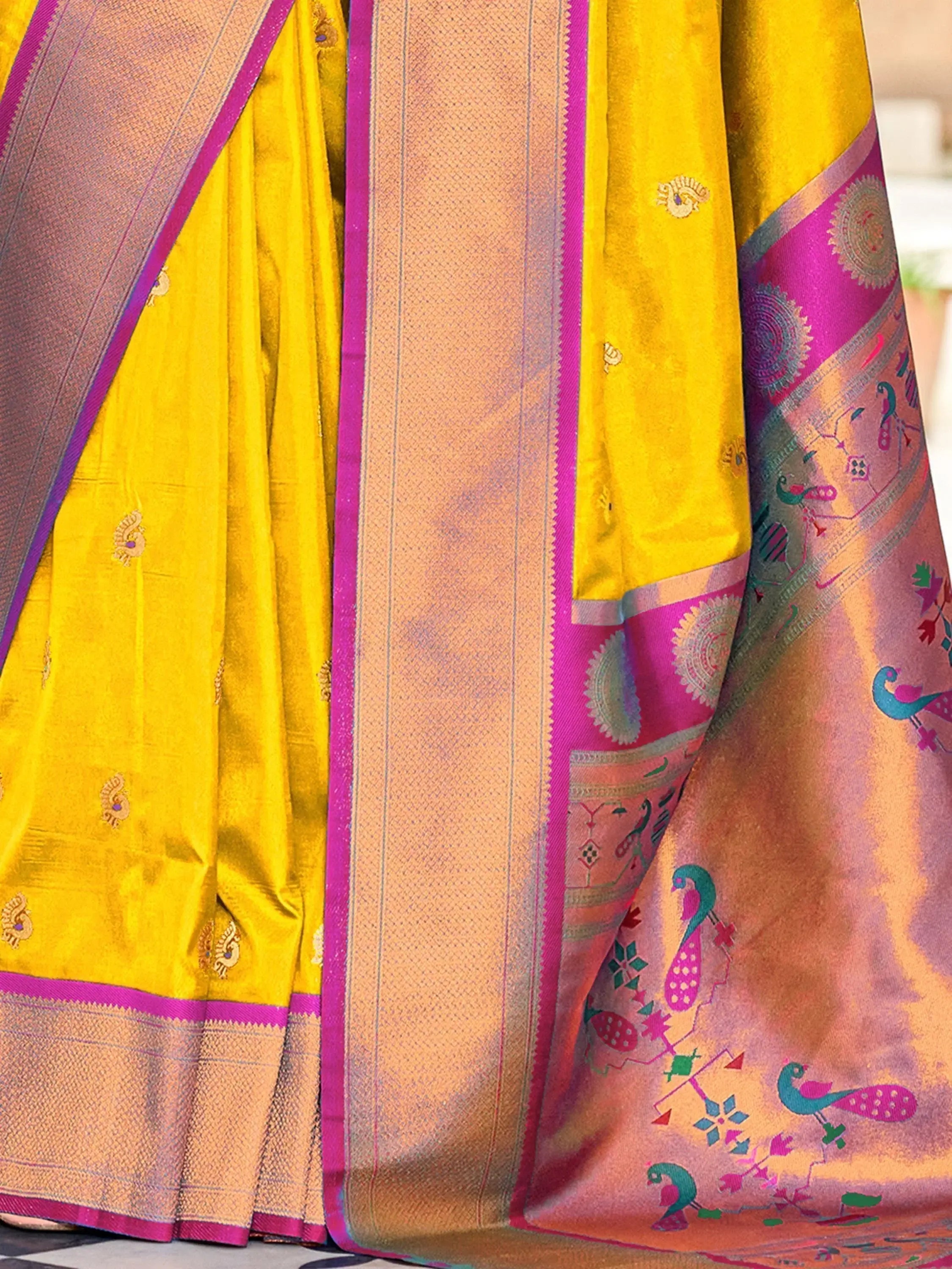 Step into a world of vibrant elegance with our yellow paithani silk saree, featuring intricate zari weaving that showcases traditional artistry. This 5.50-meter saree is a stunning choice for haldi wear and festive celebrations, radiating grace and sophistication.
