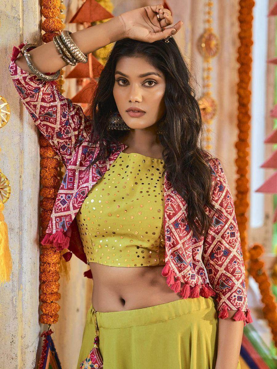 This Navaratri lehenga is full-stitched up to 42 inches and comes with fully unstitched choli material (0.65 meters).