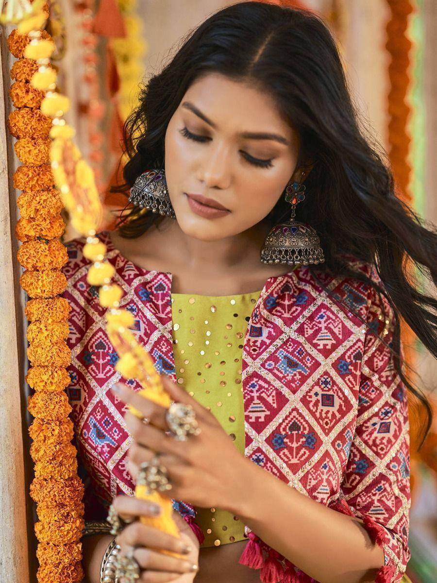 Presenting new designer mirror with embroidered fully stitched flare traditional wear chaniya choli for special Navratri and traditional garba function in collage.