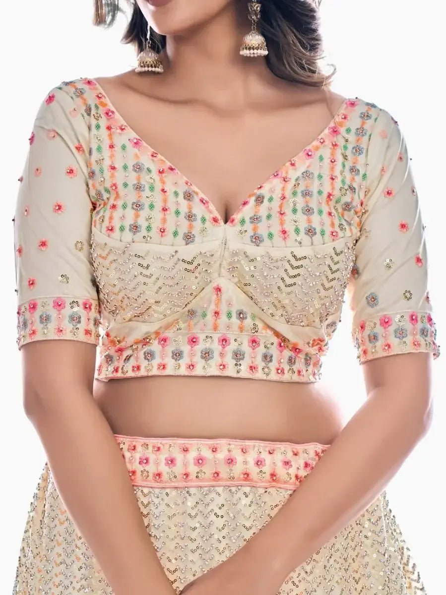 Get a contemporary yet modern look by wearing this striking off-white embroidered lehenga. This lehenga is made of heavy net material embellished with sequins, dori, zarkan, and multi-thread embroidery work all over featured.