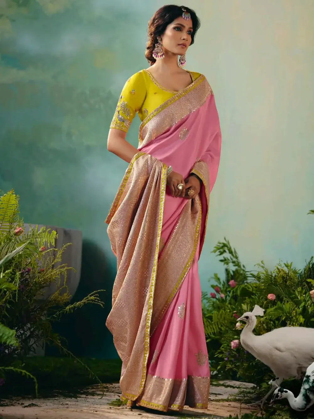 This saree set brings together a delicate baby pink drape with a striking yellow blouse, creating a fresh and vibrant contrast. The tissue fabric adds a luxurious sheen, making it ideal for festive or wedding occasions.